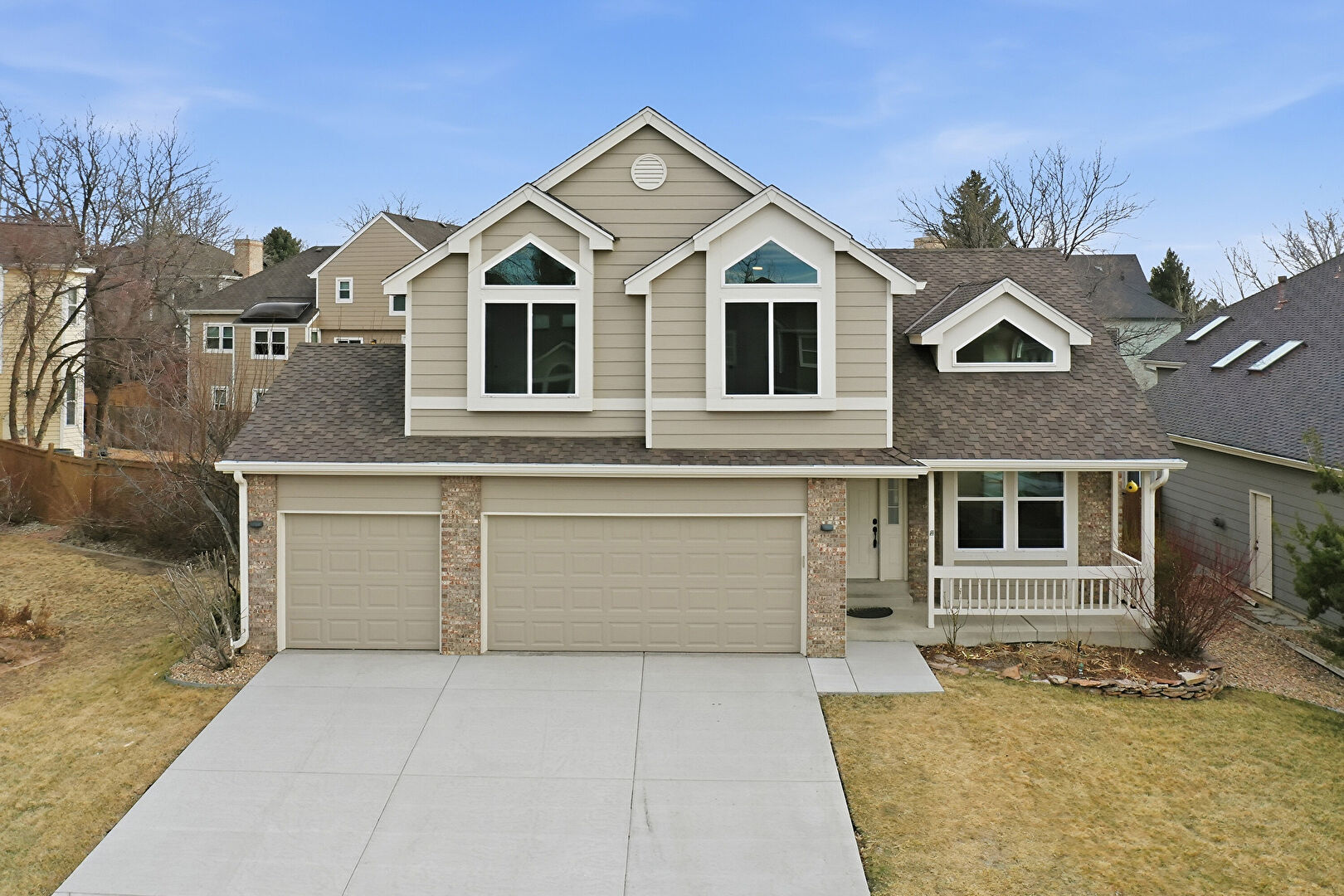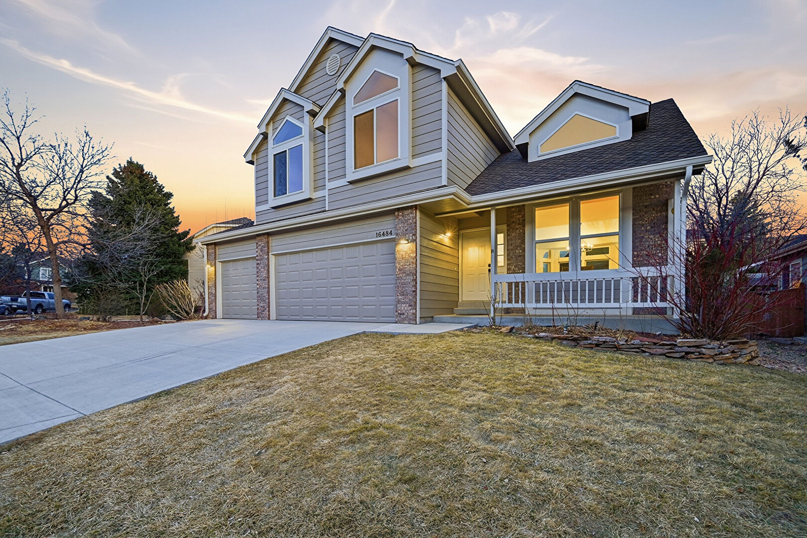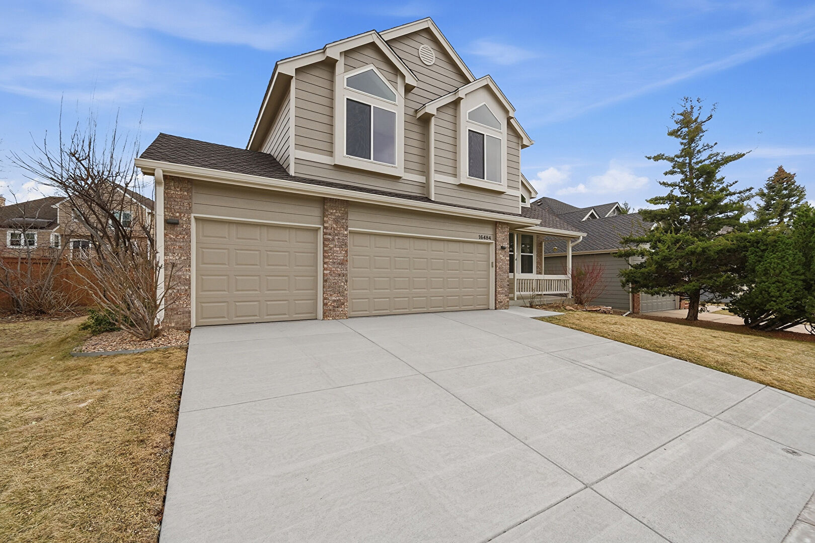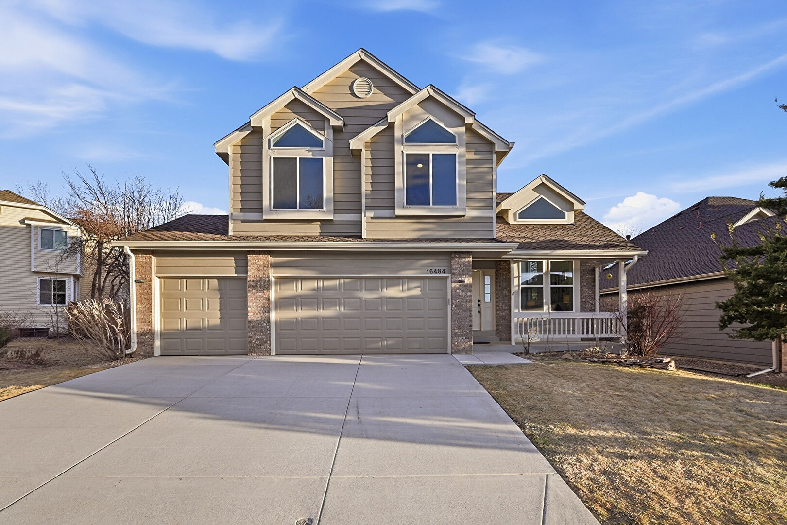 Brick Siding, Built In Garage, Downspout, Driveway, Gutters, Horizontal Siding, Porch, Horizontal Siding, Porch