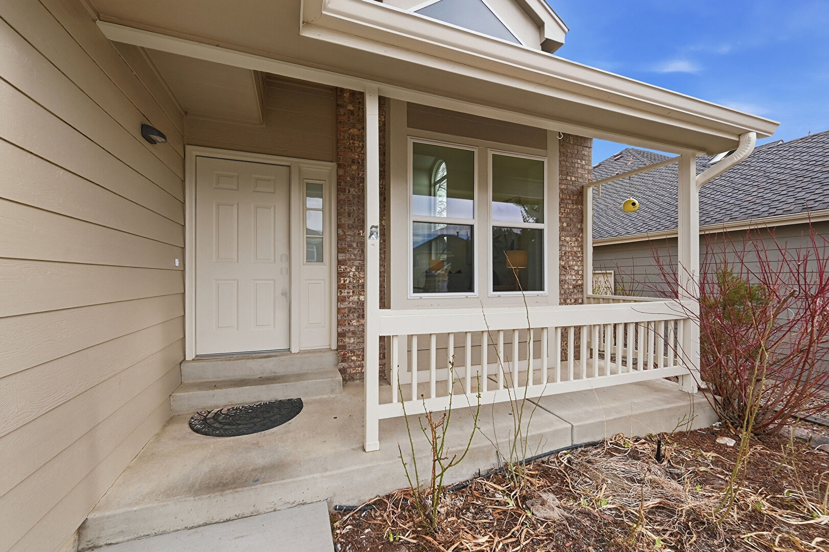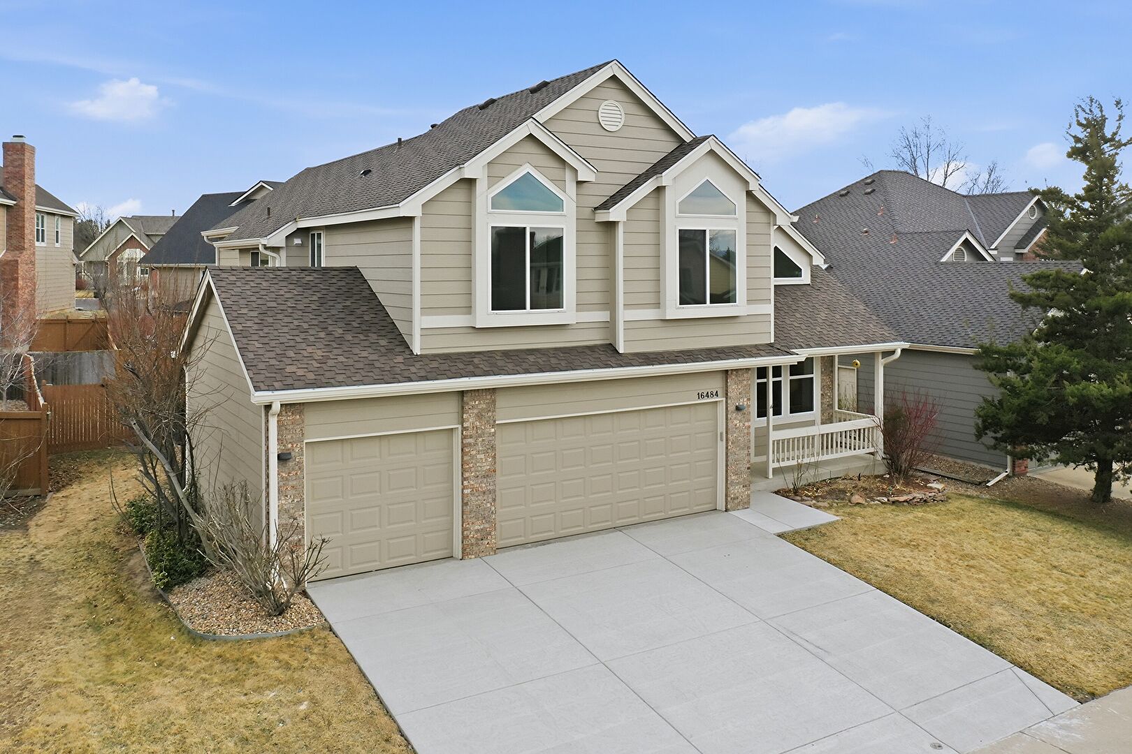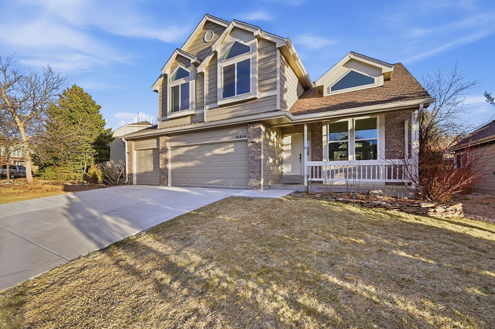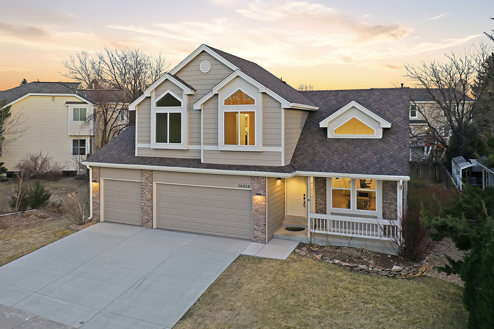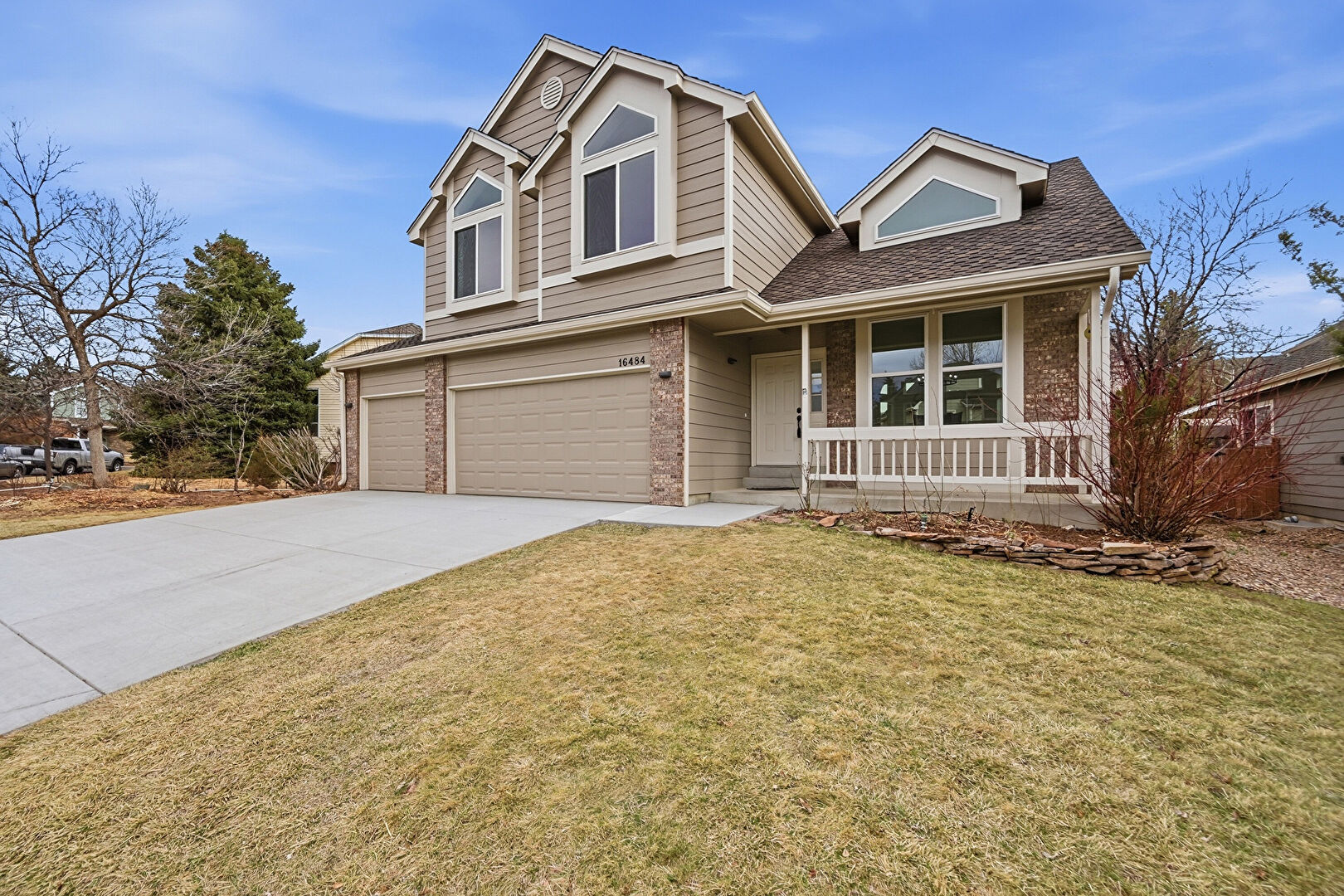 Brick Siding, Built In Garage, Downspout, Driveway, Gutters, Horizontal Siding, Porch, Horizontal Siding, Porch