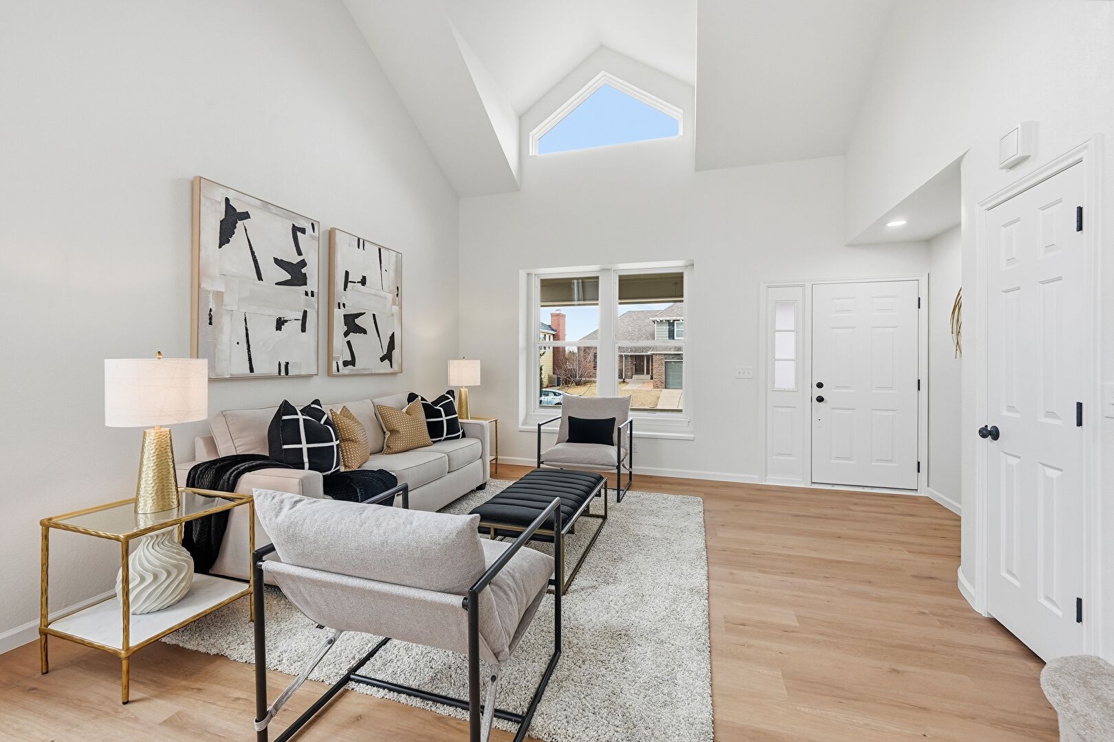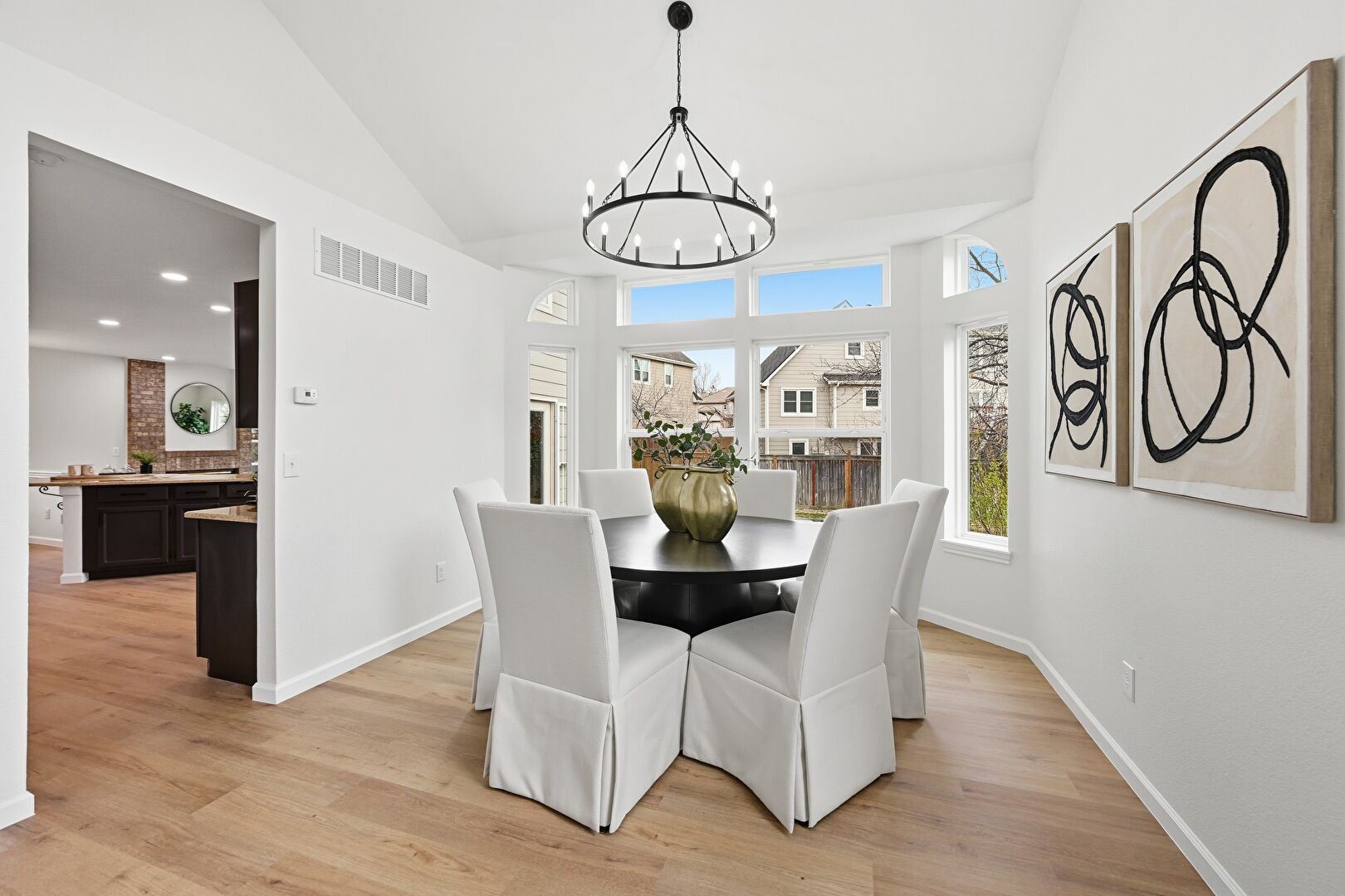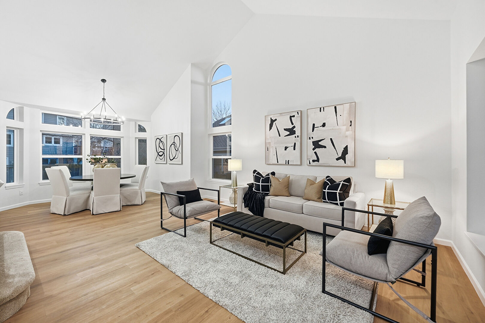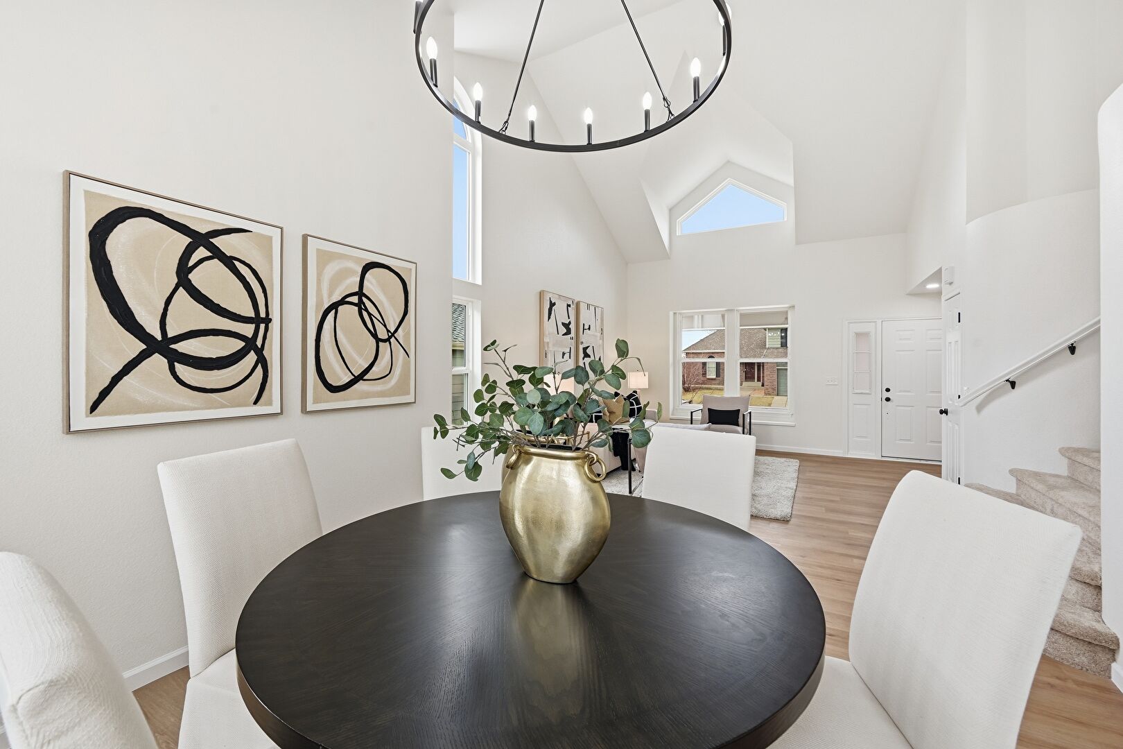 Baseboards Wall, Cathedral Ceiling, Drywall, High Ceiling, Natural Light, Notable Chandelier, Recessed Lighting, Stairs, Vaulted Ceiling, Vent, Wood Finish Floor, Drywall, High Ceiling, Wood Finish Floor
