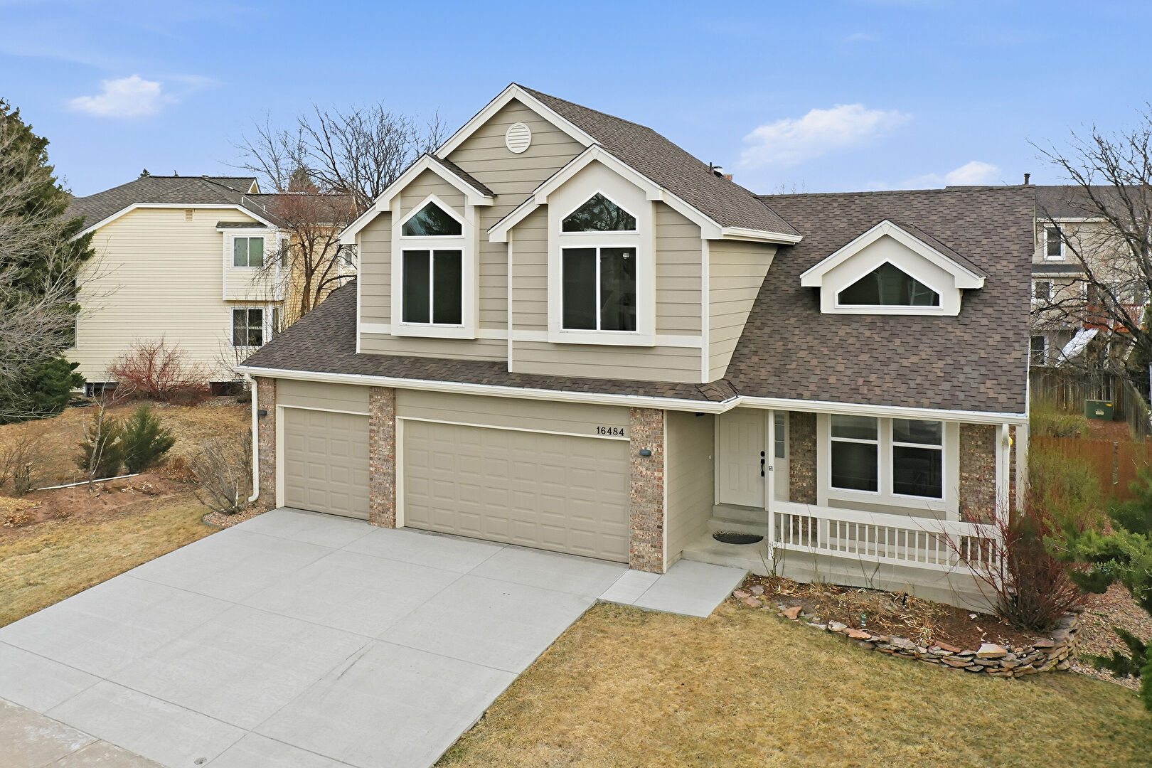 Brick Siding, Built In Garage, Dormer Roof, Downspout, Driveway, Fence, Gutters, Horizontal Siding, Lawn, Porch, Residential View, Shingle Roof, Stone Siding, Brick Siding, Built In Garage, Downspout, Driveway, Gutters, Horizontal Siding, Lawn, Stone Siding