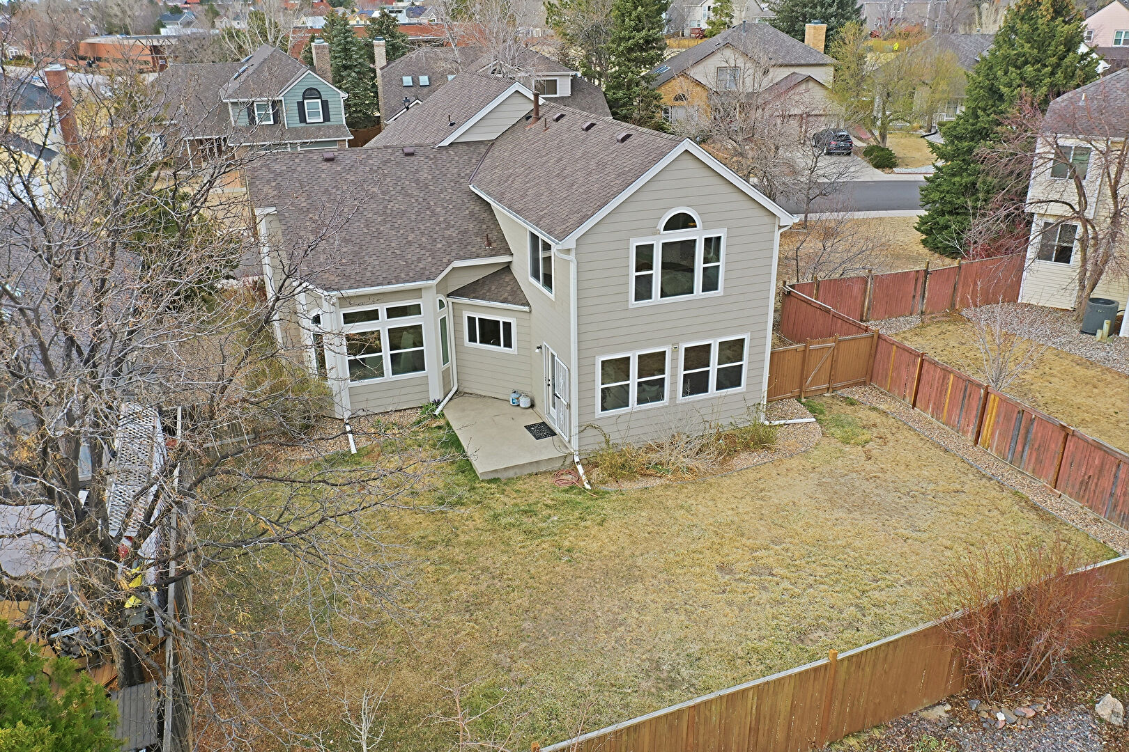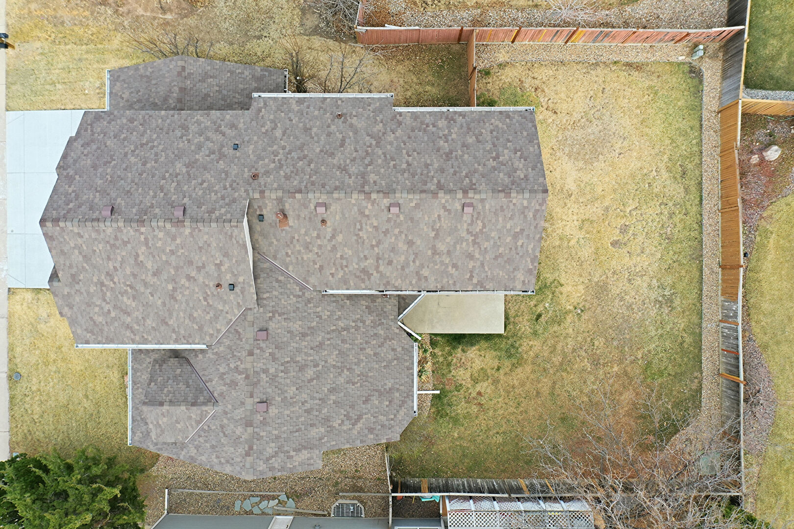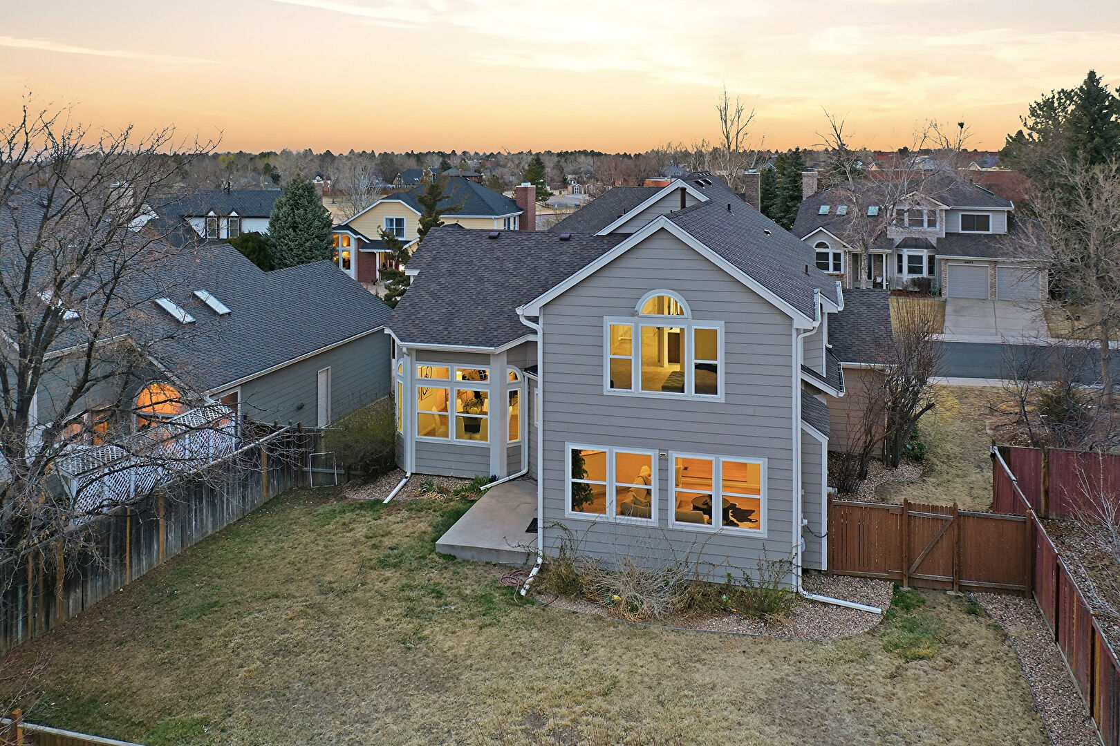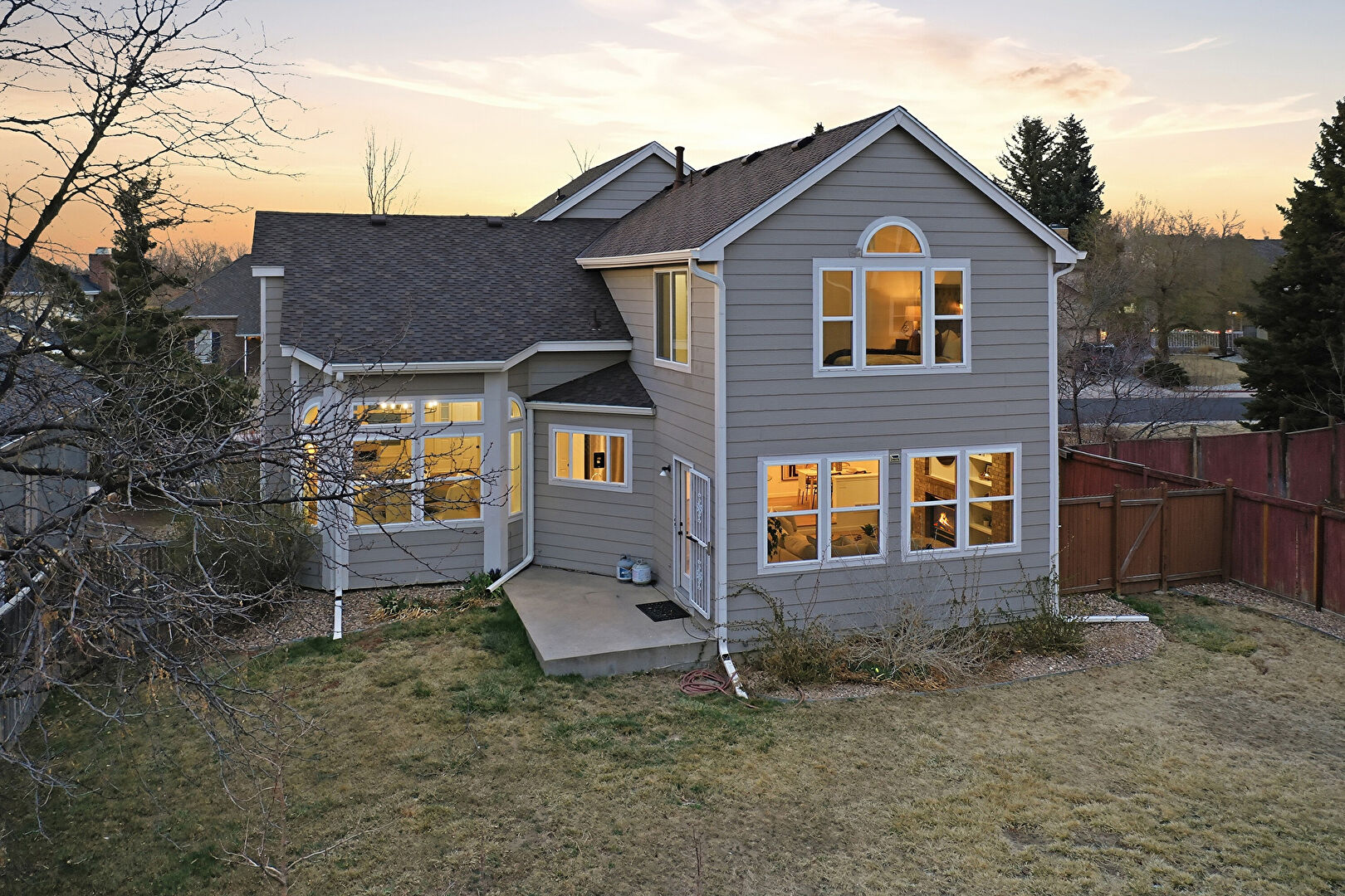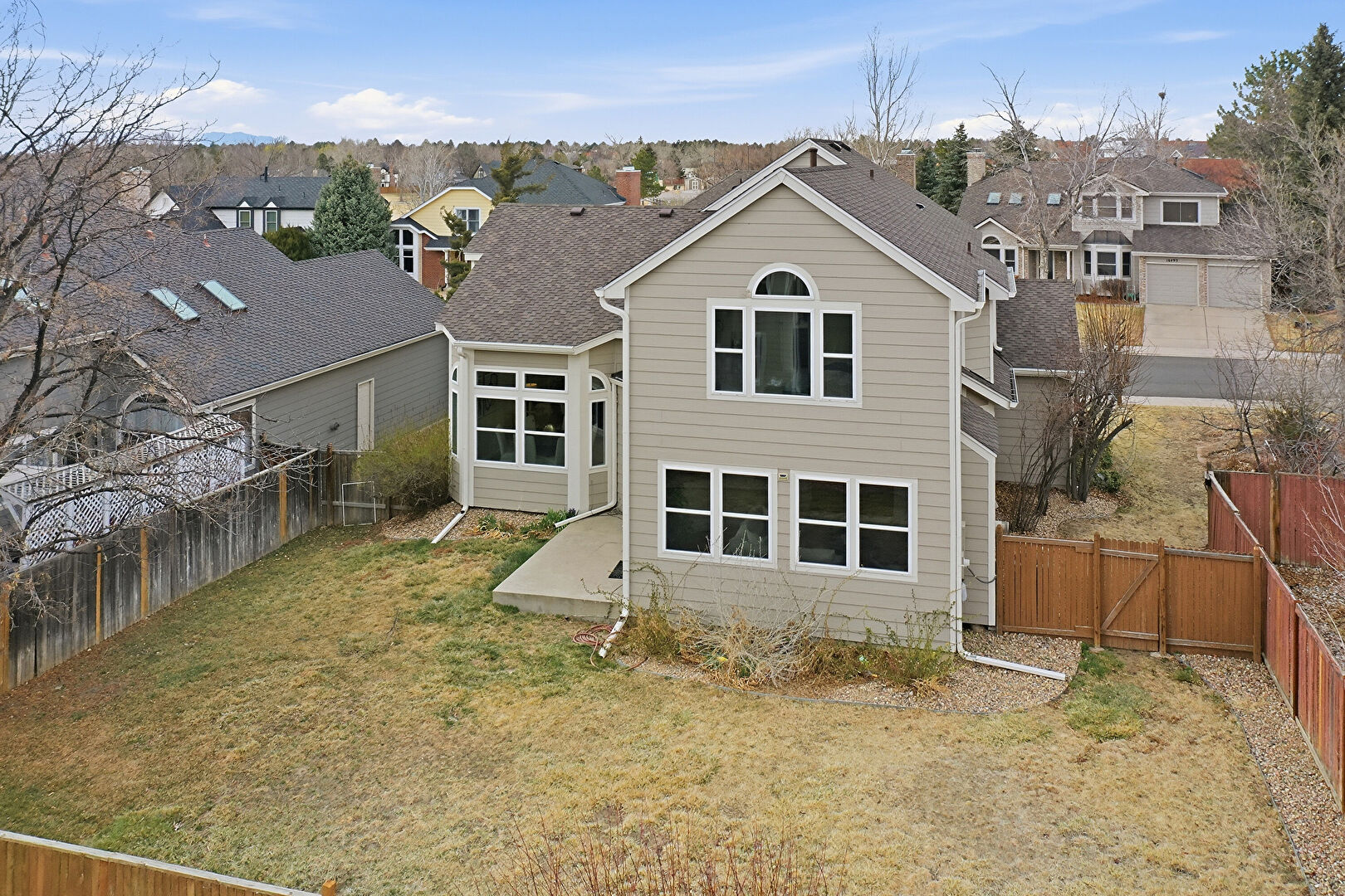 Chimney, Concrete Foundation, Downspout, Fence, Gate, Gutters, Horizontal Siding, Lawn, Patio, Residential View, Shingle Roof, Downspout, Gutters, Horizontal Siding, Lawn, Patio, Residential View