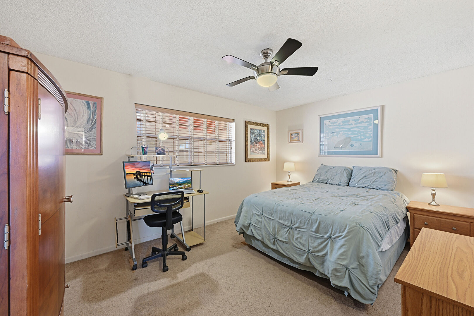 Baseboards Wall, Carpet, Ceiling Fan, Drywall, Natural Light, Office Area, Textured Ceiling, Baseboards Wall, Textured Ceiling