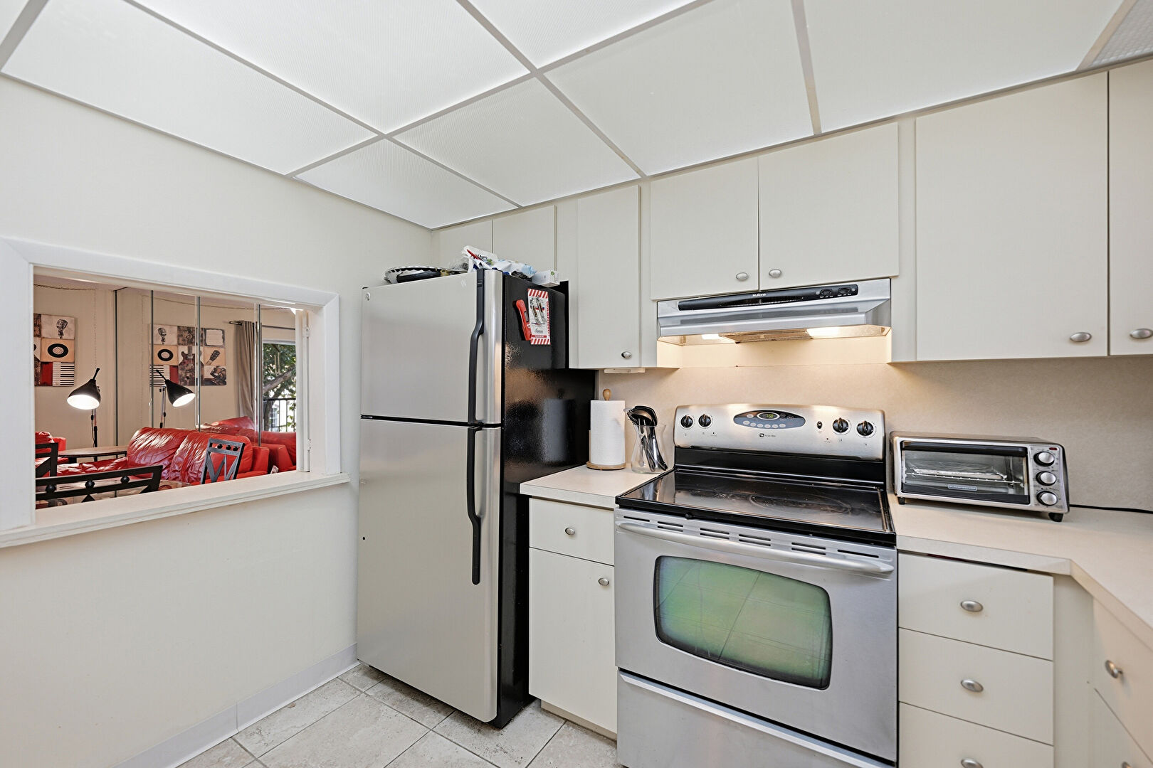 Baseboards Wall, Drop Ceiling, Drywall, Natural Light, Tile Floor, Toaster, Baseboards Wall, Toaster