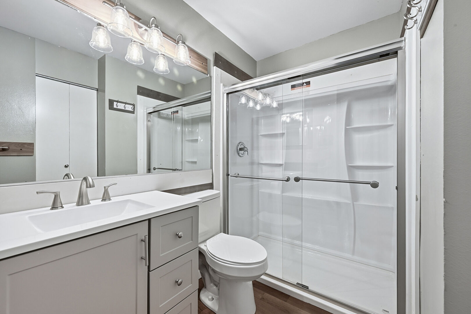 Drywall, Full Bathroom, Vanity, Wood Finish Floor
