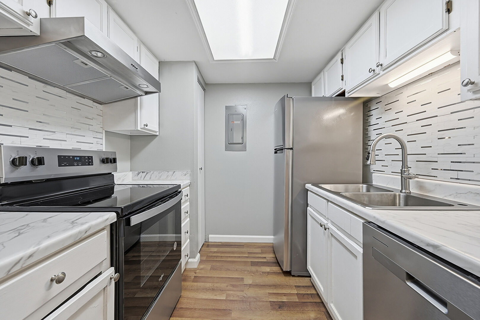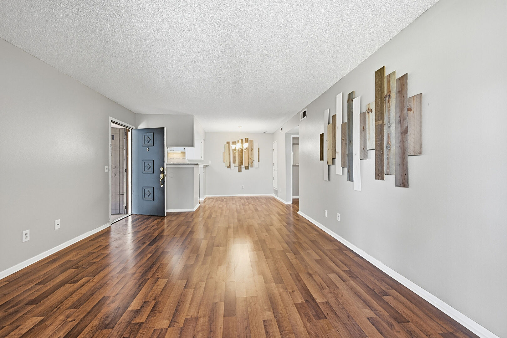 Baseboards Wall, Drywall, Electric Panel, Fireplace, Natural Light, Notable Chandelier, Pendant Lighting, Shaker Cabinets, Textured Ceiling, Vent, Visible Hinge Cabinets, Wood Finish Floor, Drywall, Electric Panel, Opens To Living Area
