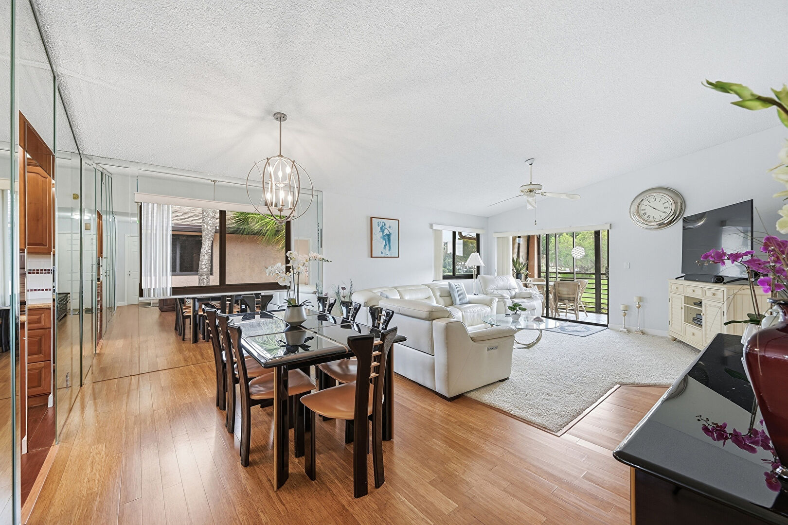 Ceiling Fan, Drywall, Notable Chandelier, Textured Ceiling, Vaulted Ceiling, Vent, Wood Finish Floor, Natural Light