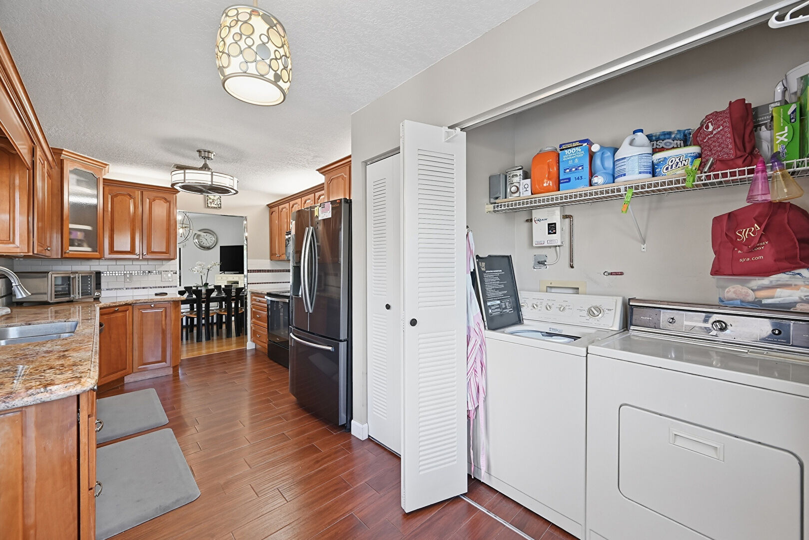 Arched Cabinets, Baseboards Wall, Ceiling Fan, Crown Molding Cabinets, Drywall, Glass Insert Cabinets, Laundry, Medium Brown Cabinets, Natural Light, Notable Chandelier, Pendant Lighting, Raised Cabinets, Stone Countertops, Textured Ceiling, Toaster, U Shaped Kitchen, Washer Hookup, Wood Finish Floor, Medium Brown Cabinets, Pendant Lighting, Stone Countertops