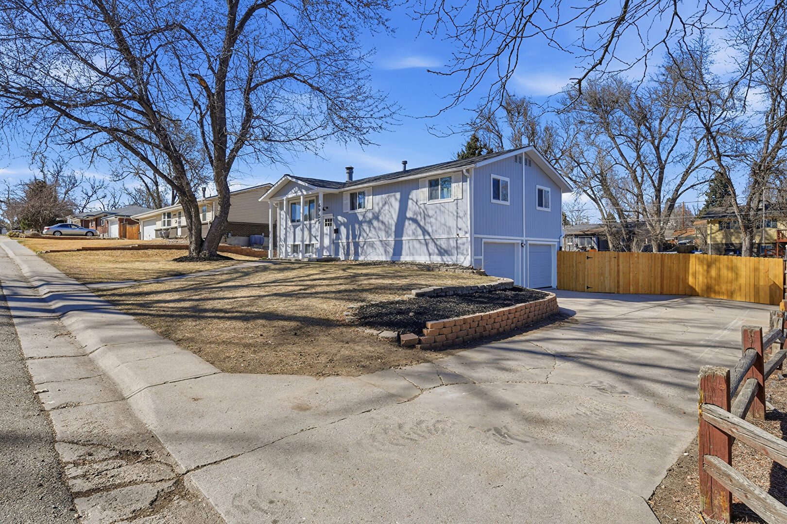 Basement Garage, Built In Garage, Downspout, Driveway, Fence, Lawn, Vertical Siding, Fence, Gutters