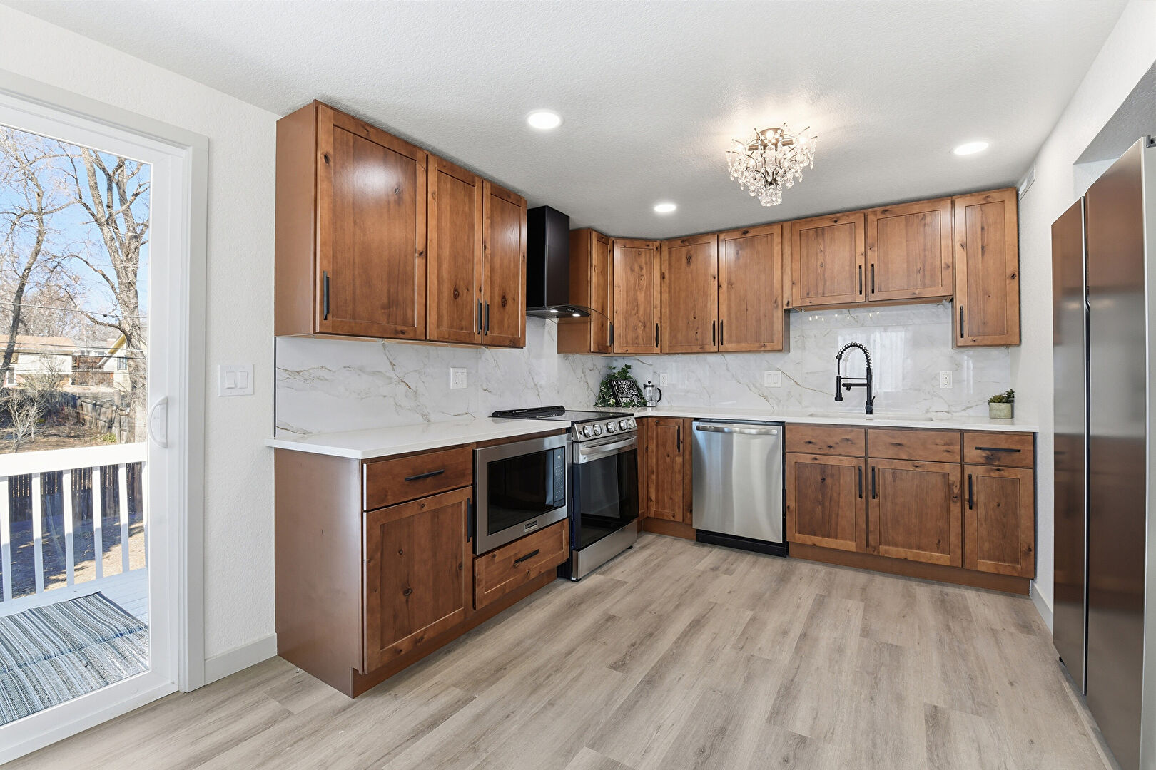 Baseboards Wall, Drywall, Medium Brown Cabinets, Natural Light, Notable Chandelier, Recessed Lighting, Shaker Cabinets, Stone Countertops, Textured Ceiling, U Shaped Kitchen, Vent, Wood Finish Floor, Baseboards Wall, Drywall, Natural Light, Recessed Lighting