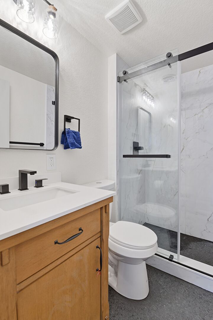 Aggregate Floor, Baseboard Radiator, Full Bathroom, Textured Ceiling, Textured Wall, Vanity, Vent, Full Bathroom, Textured Ceiling