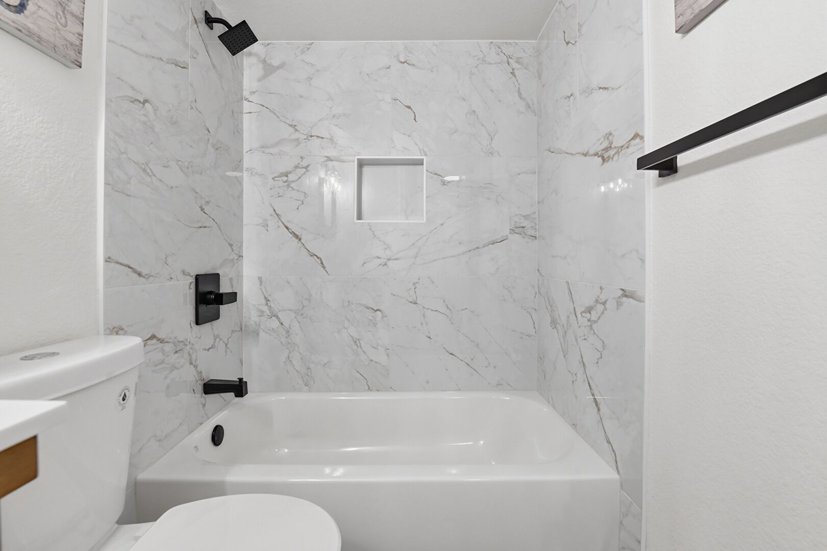 Combined Bath Shower, Drywall, Full Bathroom, Vanity, Textured Wall, Vanity