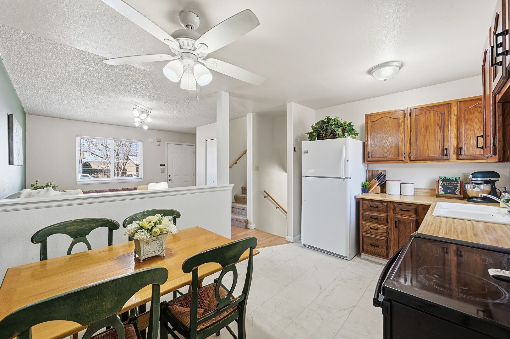 Arched Cabinets, Baseboards Wall, Butcher Block Countertops, Ceiling Fan, Drywall, L Shaped Kitchen, Marble Finish Floor, Medium Brown Cabinets, Natural Light, Shaker Cabinets, Textured Ceiling, Visible Hinge Cabinets, Medium Brown Cabinets, Opens To Living Area