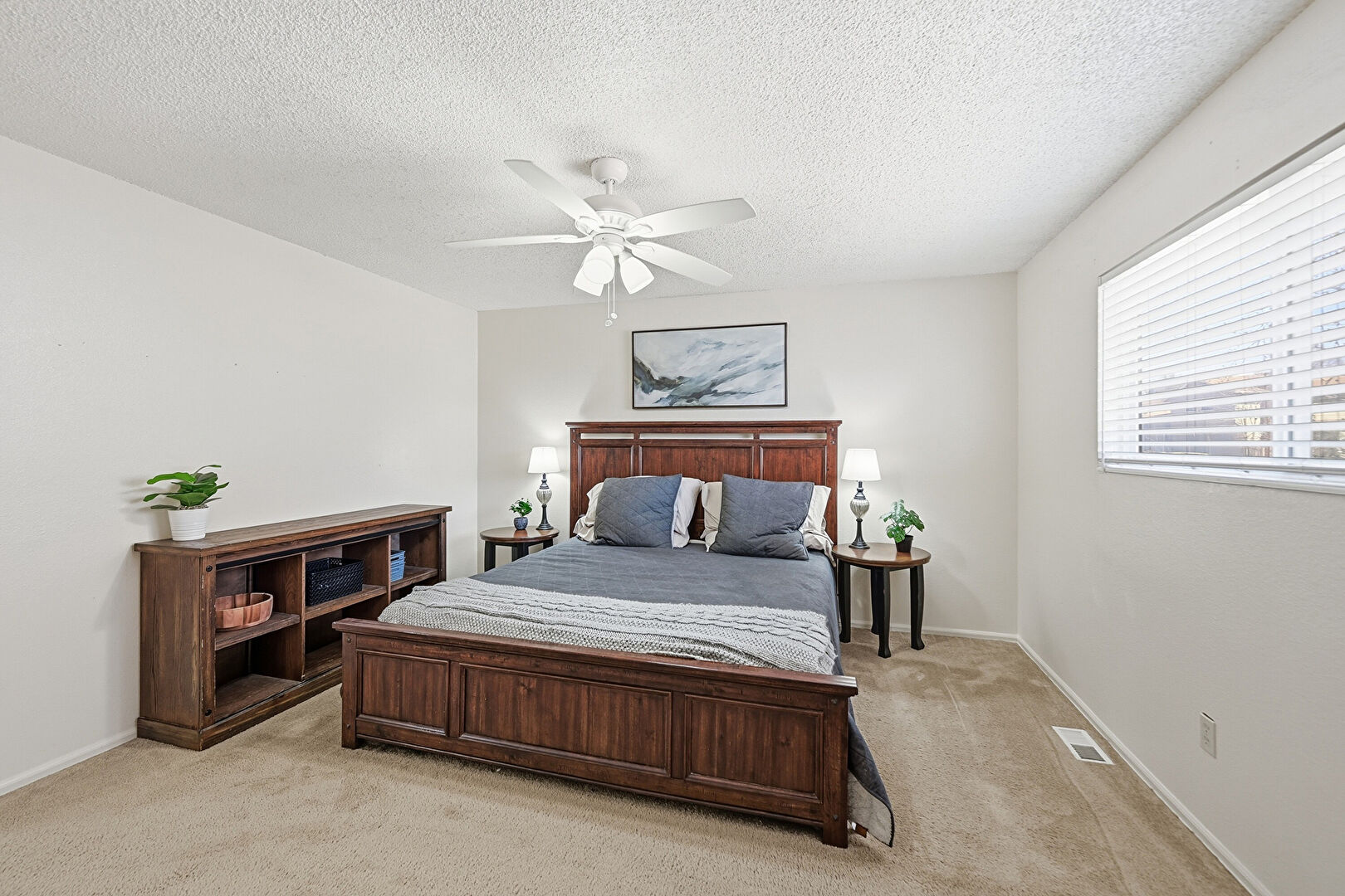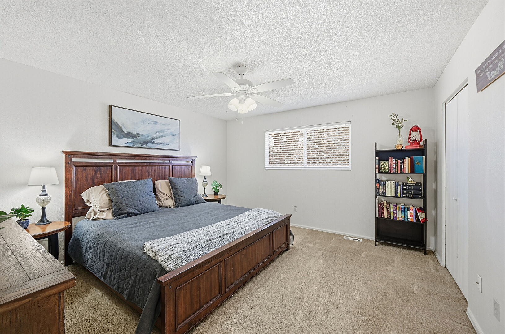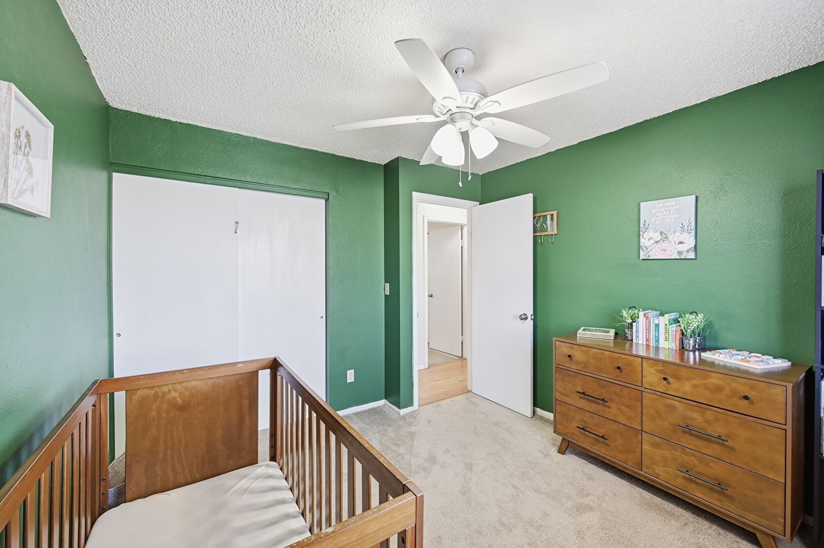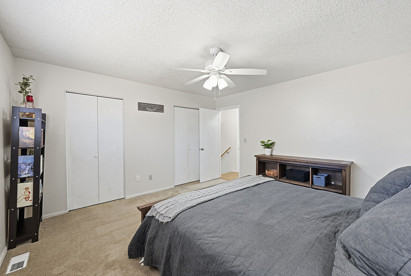 Baseboards Wall, Carpet, Ceiling Fan, Closet, Drywall, Natural Light, Nursery, Textured Ceiling, Textured Wall, Vent, Carpet, Closet, Drywall, Ensuite Bathroom, Two Closets