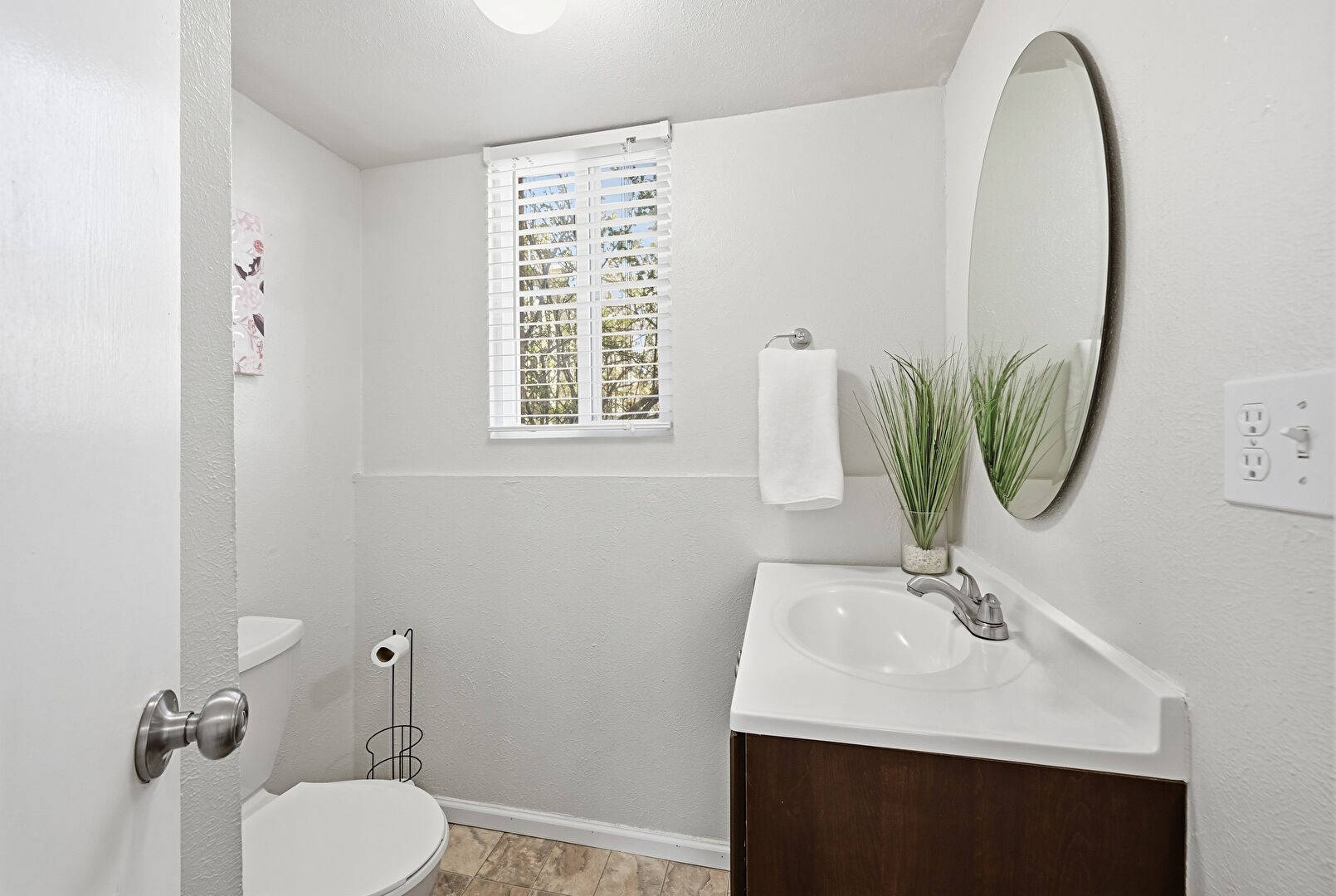 Combined Bath Shower, Drywall, Half Bathroom, Natural Light, Stone Finish Floor, Textured Wall, Vanity, Baseboards Wall, Full Bathroom