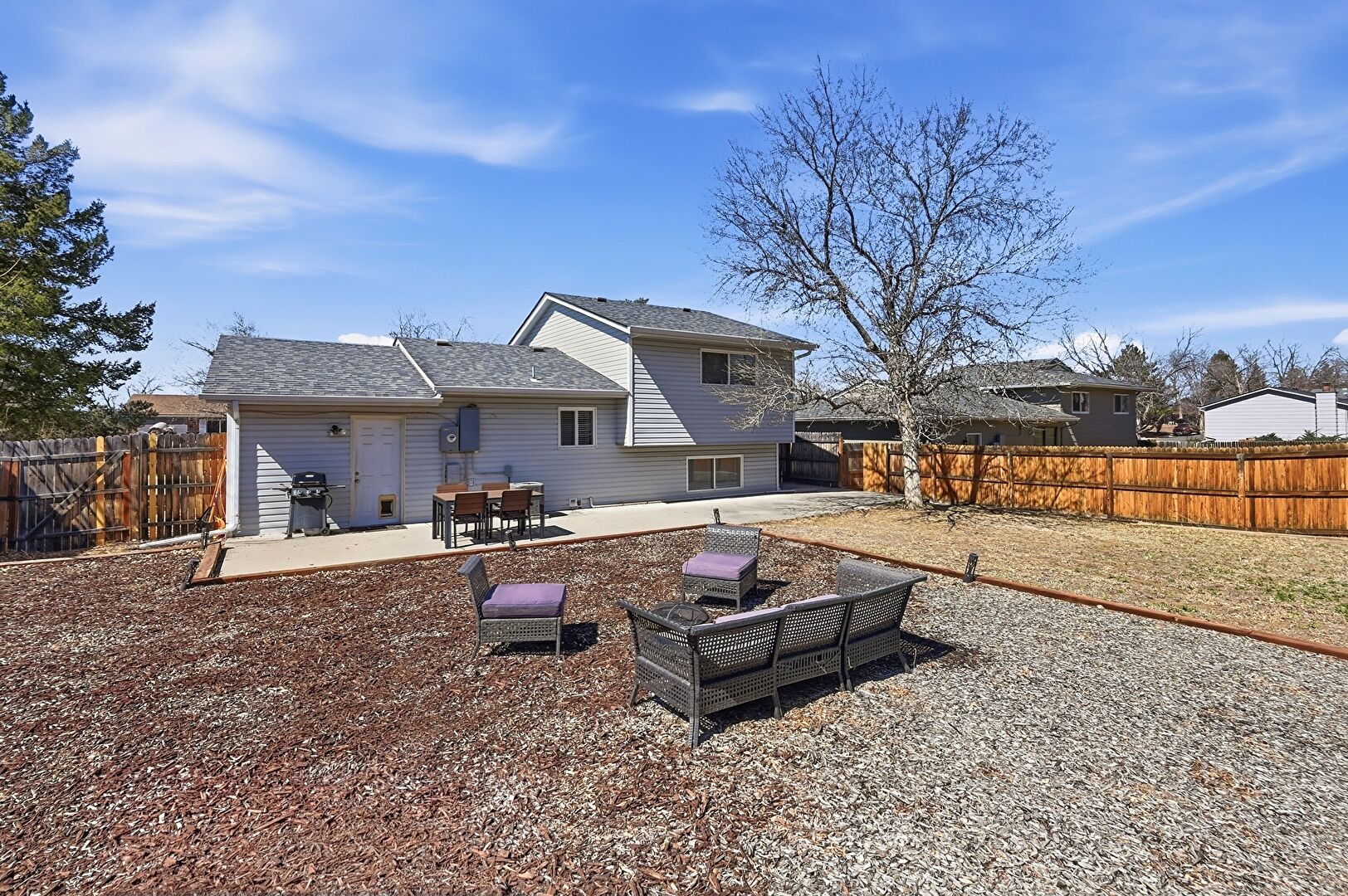 Downspout, Grill, Horizontal Siding, Outdoor Dining Area, Patio, Residential View, Shingle Roof, Fence
