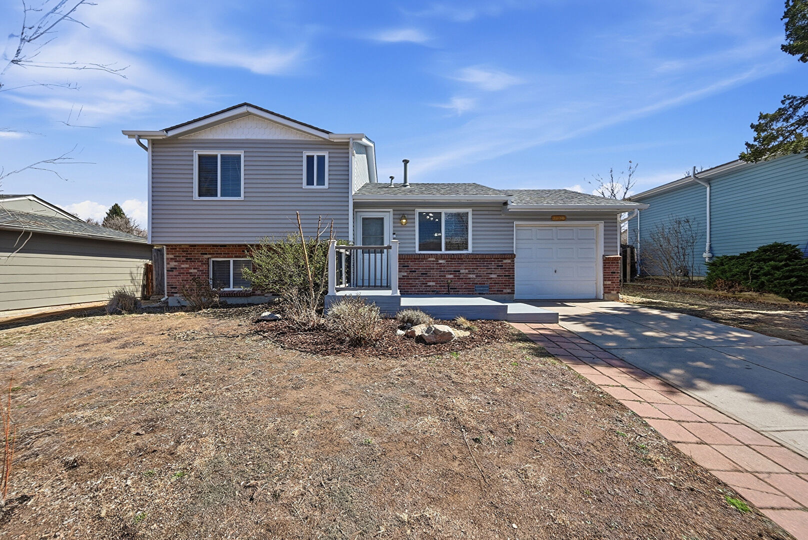 Brick Siding, Concrete Foundation, Deck, Downspout, Driveway, Fence, Gutters, Horizontal Siding, Concrete Foundation, Driveway