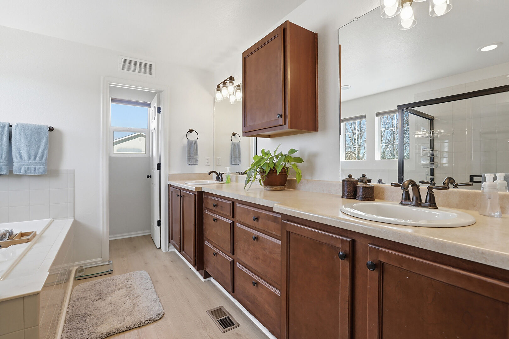 Baseboards Wall, Combined Bath Shower, Double Vanity, Drywall, Ensuite Bathroom, Full Bathroom, Half Bathroom, Natural Light, Notable Chandelier, Recessed Lighting, Textured Wall, Vanity, Vent, Wood Finish Floor, Carpet, Double Vanity, Ensuite Bathroom, Full Bathroom, Half Bathroom, Natural Light, Tile Floor, Vanity