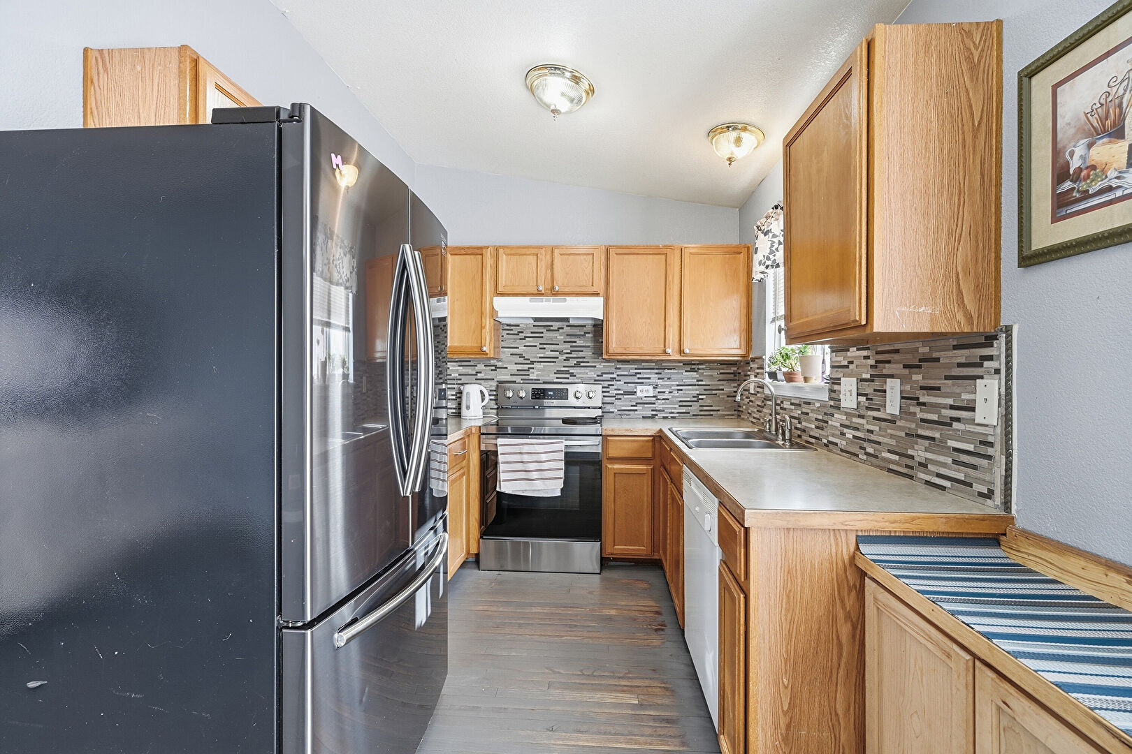 Drywall, Natural Light, Shaker Cabinets, U Shaped Kitchen, Wood Finish Floor, Vaulted Ceiling