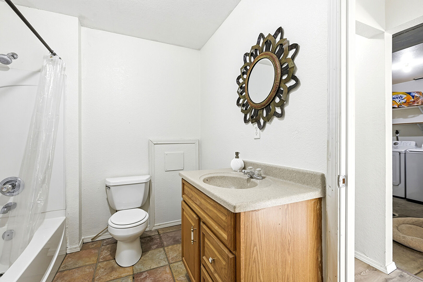 Baseboards Wall, Combined Bath Shower, Drywall, Full Bathroom, Laundry, Stone Finish Floor, Vanity