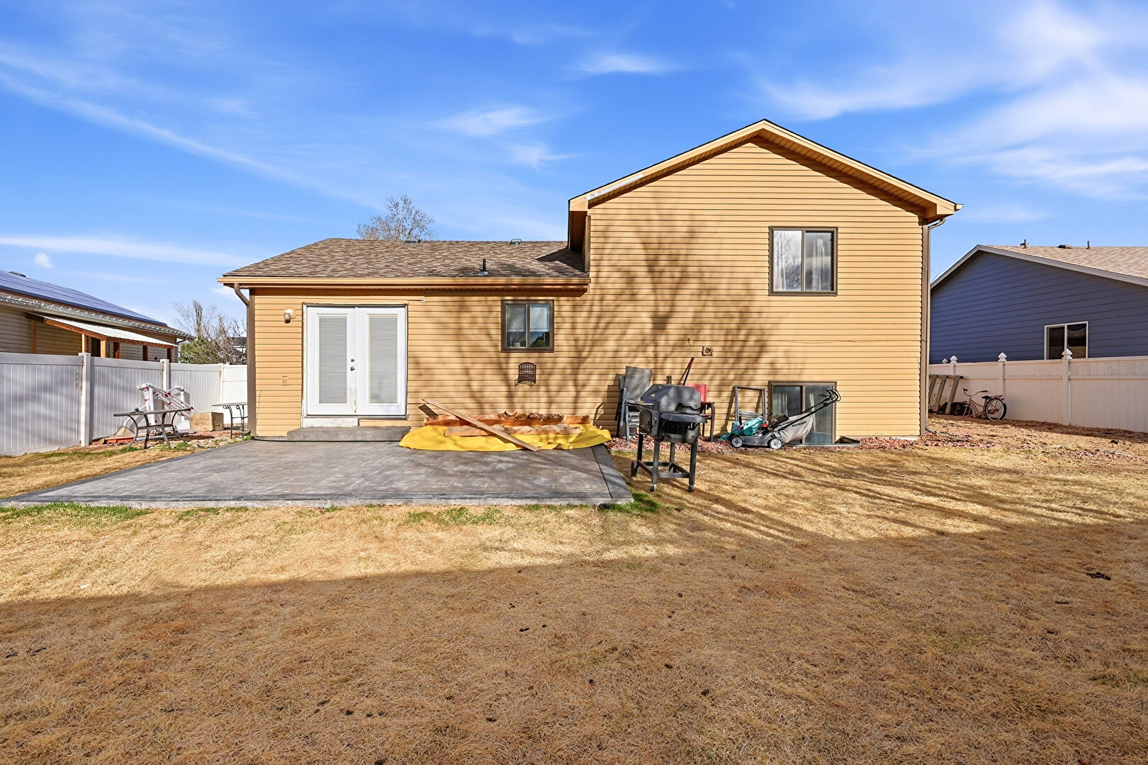 Downspout, Fence, French Doors, Grill, Horizontal Siding, Lawn, Patio, Shingle Roof, Gutters