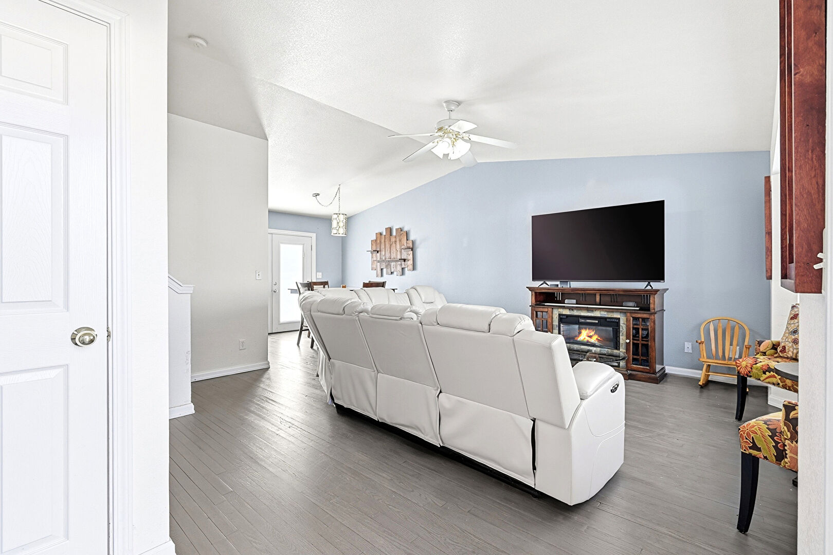 Baseboards Wall, Cathedral Ceiling, Ceiling Fan, Drywall, Fireplace, Natural Light, Stairs, Vaulted Ceiling, Wood Finish Floor, Baseboards Wall, Ceiling Fan