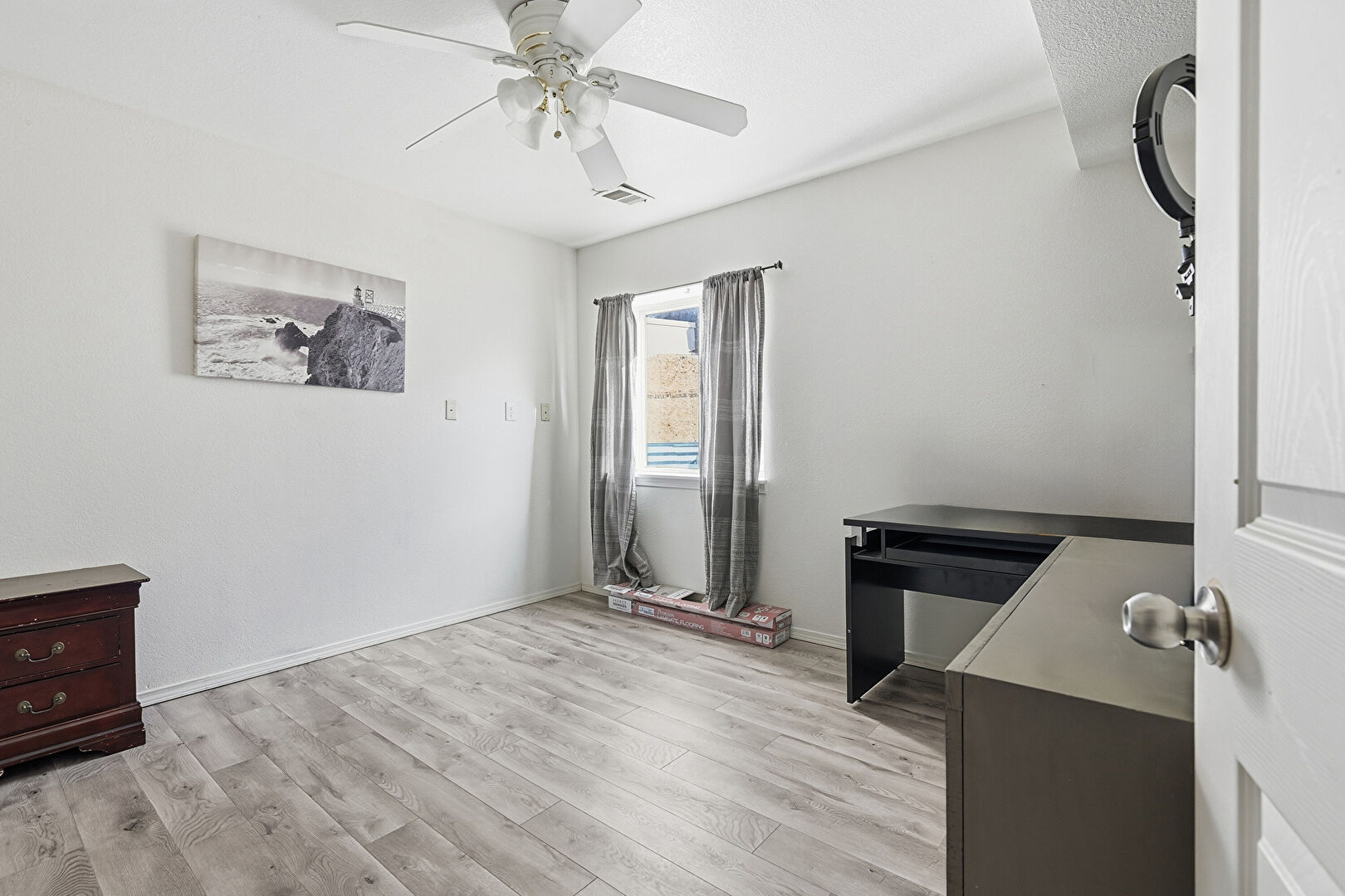 Ceiling Fan, Drywall, Natural Light, Textured Ceiling, Vent, Wood Finish Floor, Baseboards Wall