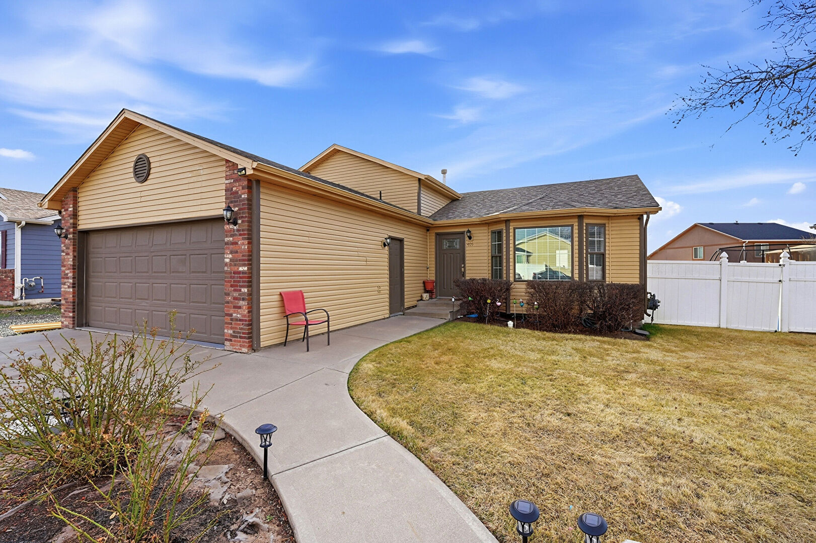 Brick Siding, Downspout, Driveway, Fence, Gas Meter, Gutters, Horizontal Siding, Lawn, Shingle Roof, Brick Siding, Driveway