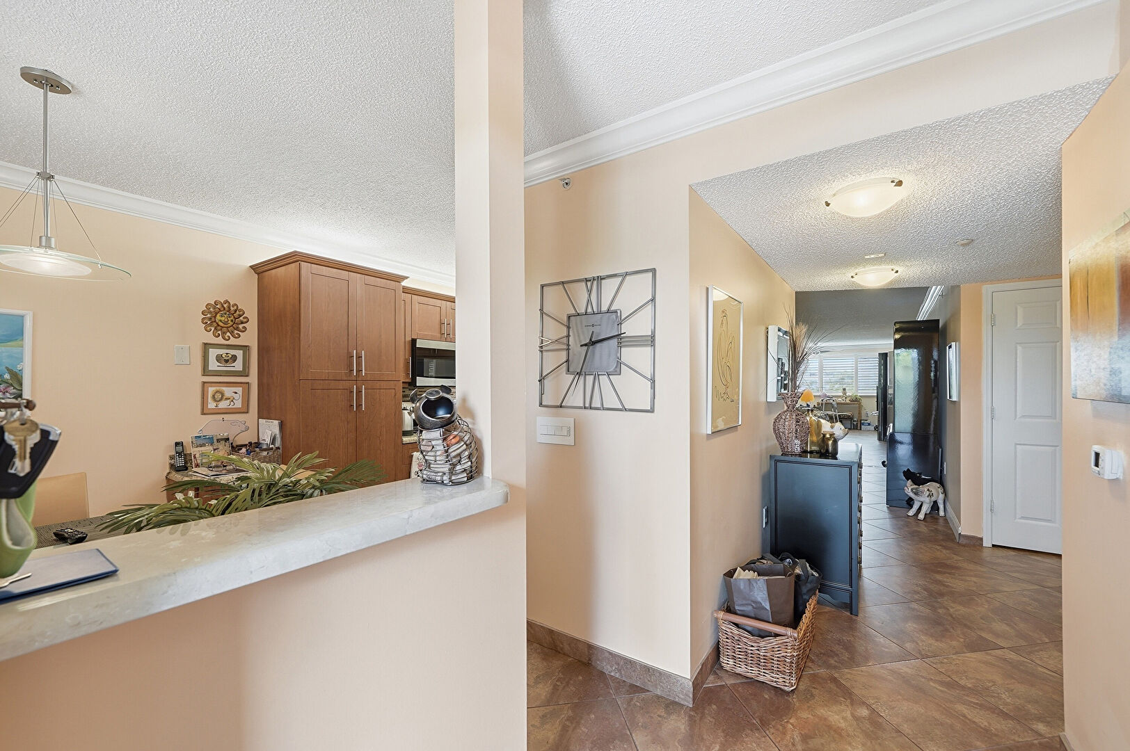 Baseboards Wall, Crown Molding, Drywall, Natural Light, Smoke Carbon Monoxide Detector, Textured Ceiling, Tile Floor, Vent, Drywall, Tile Floor