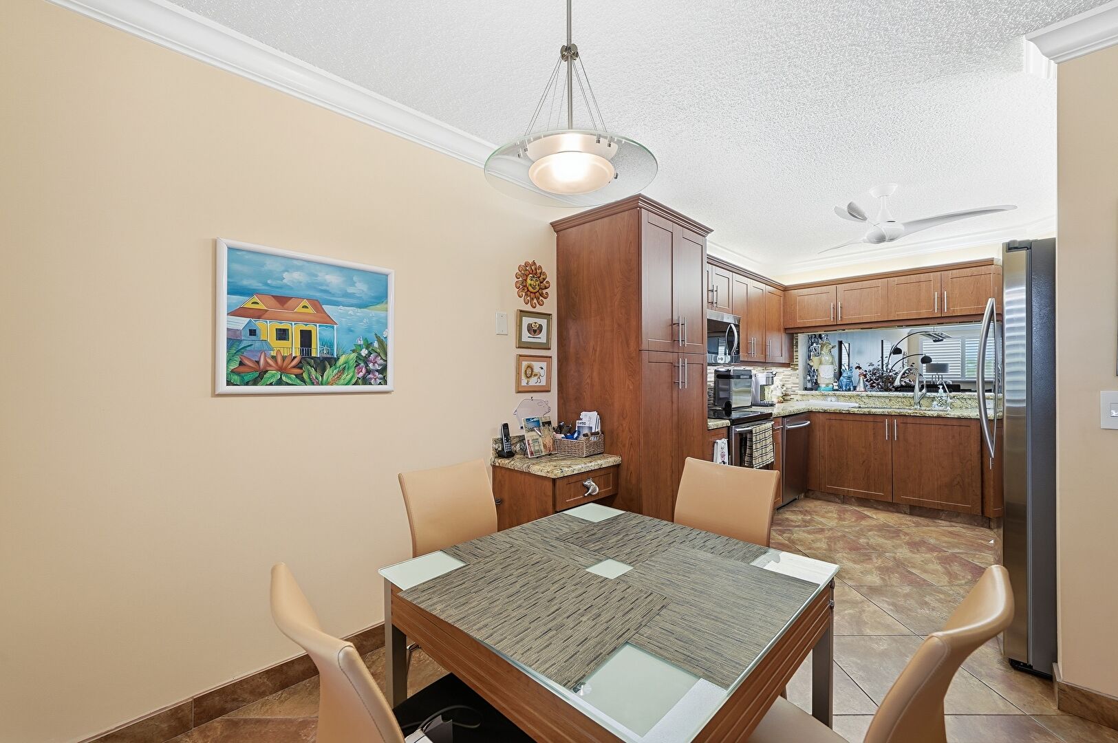 Baseboards Wall, Ceiling Fan, Crown Molding, Drywall, Natural Light, Textured Ceiling, Tile Floor