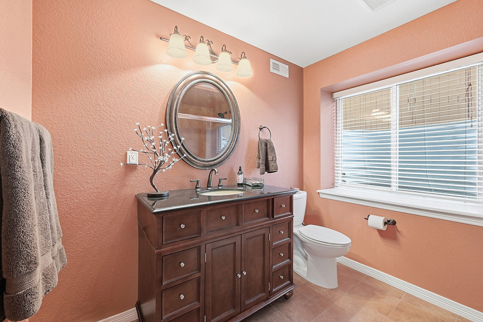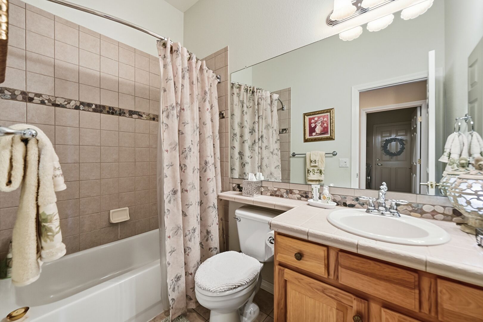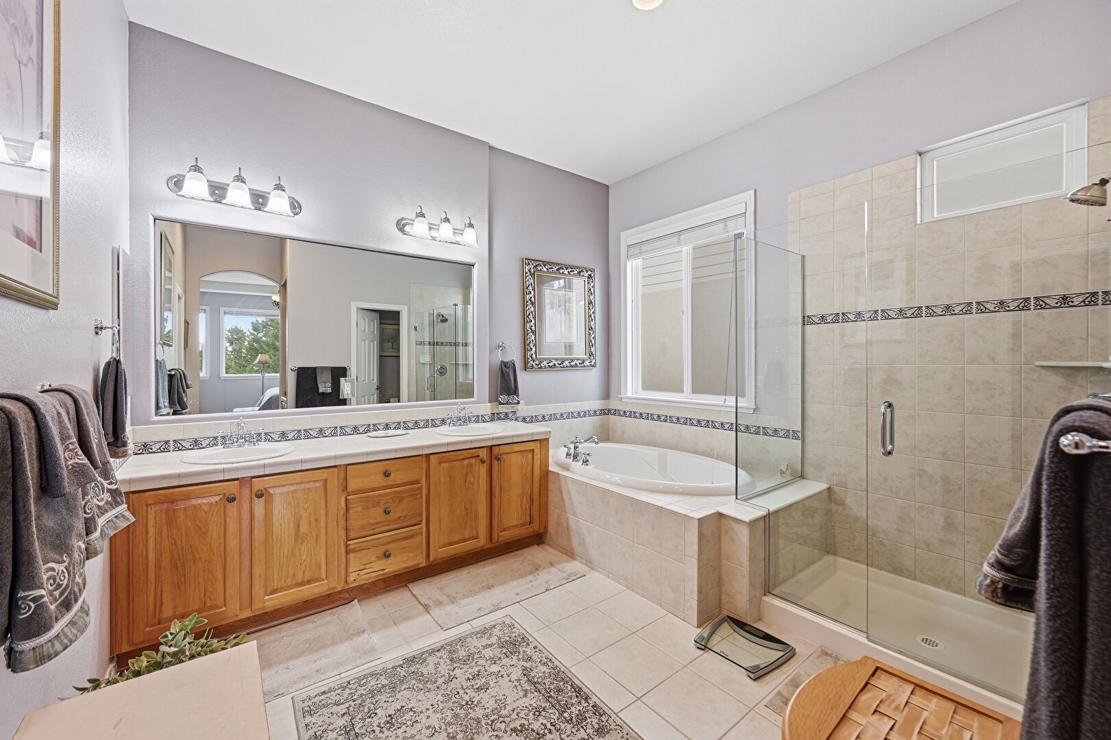 Baseboards Wall, Carpet, Combined Bath Shower, Drywall, Ensuite Bathroom, Full Bathroom, Natural Light, Textured Ceiling, Textured Wall, Tile Floor, Vanity, Vent, Water Closet, Baseboards Wall, Double Vanity, Natural Light, Textured Wall, Vanity
