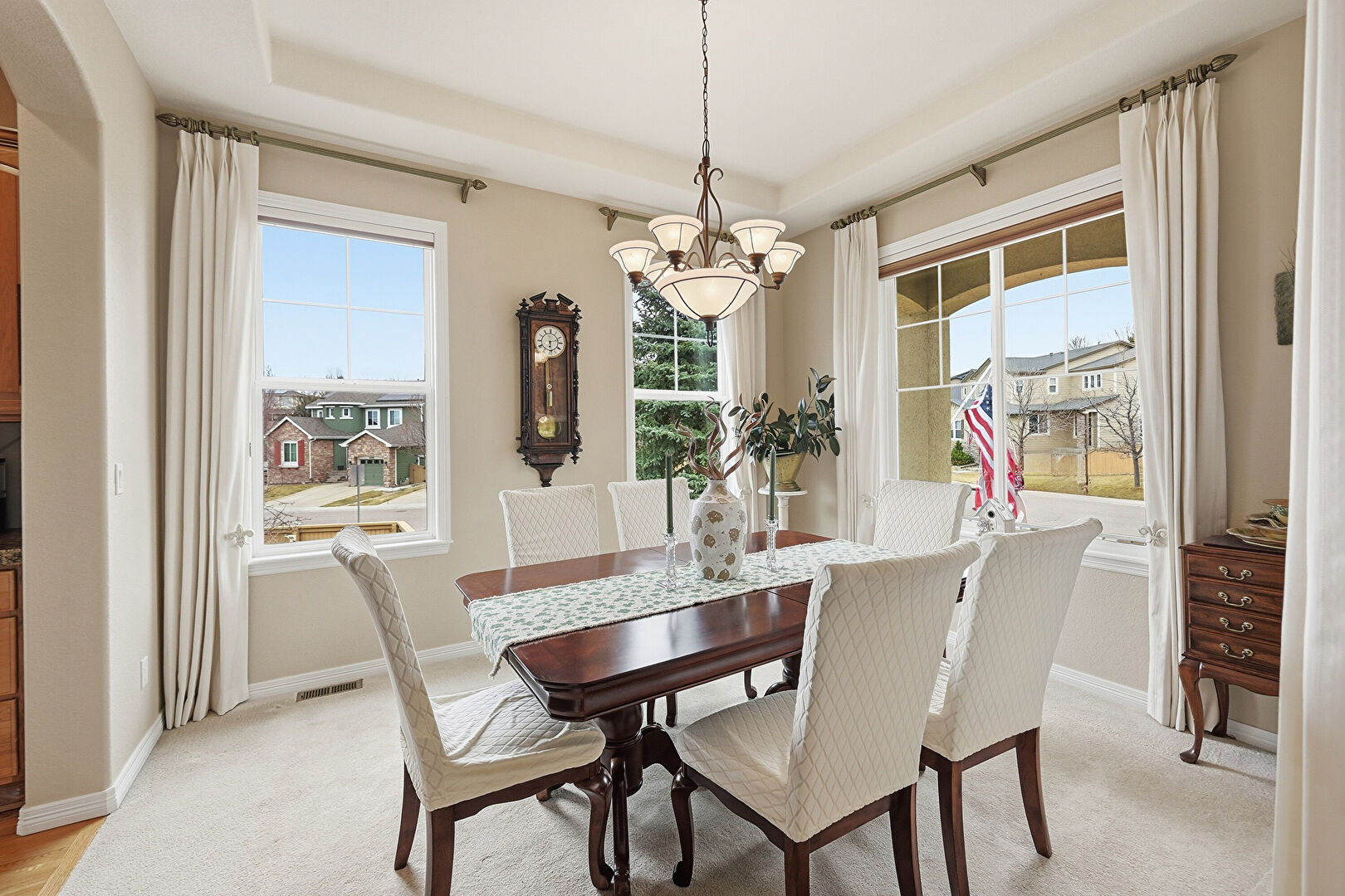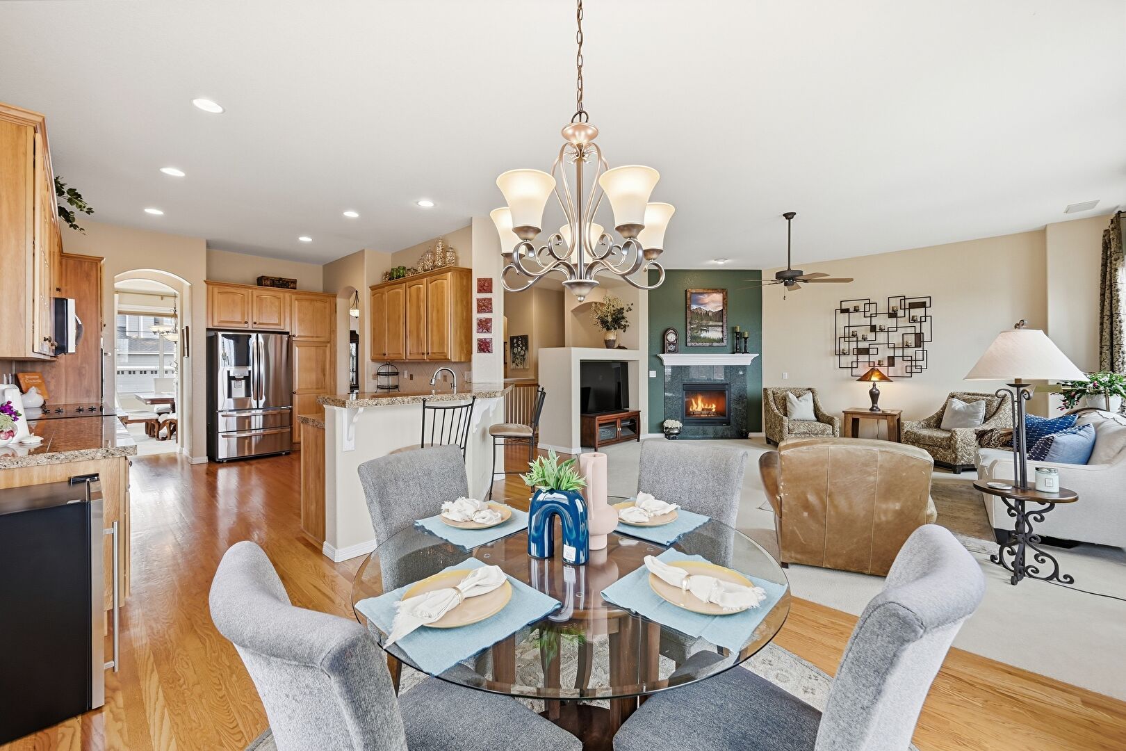 Arched Walkways, Baseboards Wall, Carpet, Ceiling Fan, Drywall, Fireplace, G Shaped Kitchen, Natural Light, Notable Chandelier, Recessed Lighting, Vent, Wood Finish Floor, Drywall, Notable Chandelier, Tray Ceiling, Wine Cooler