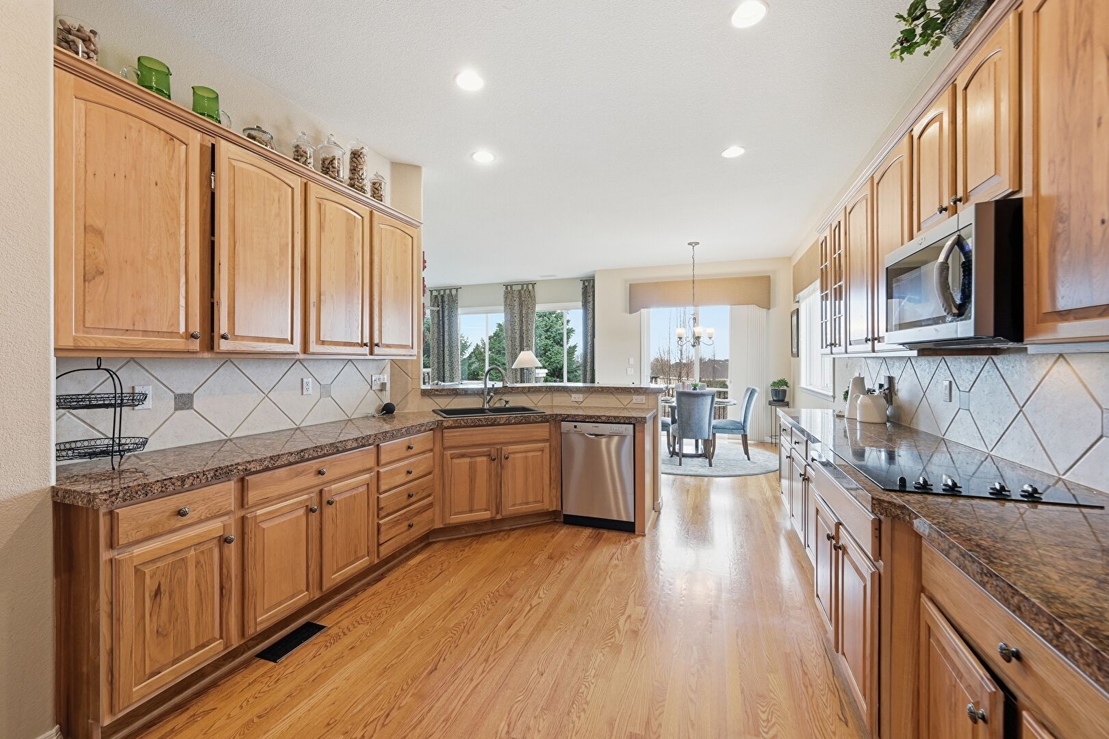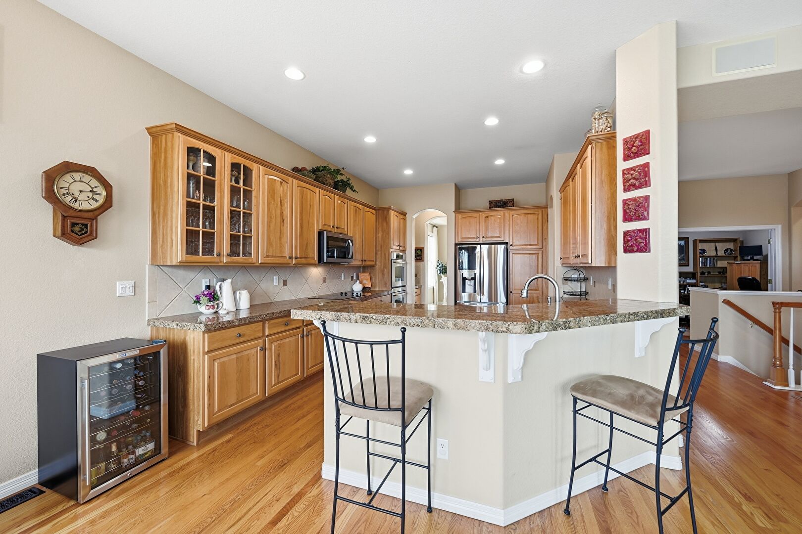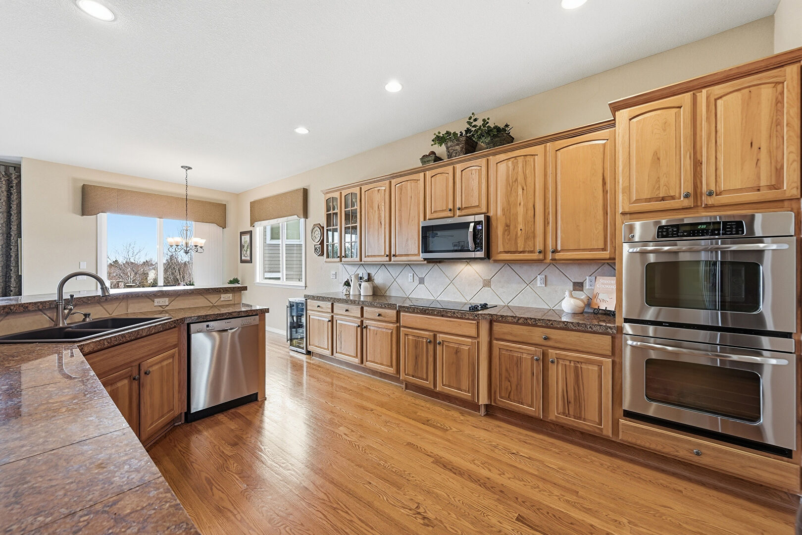 Arched Cabinets, Arched Walkways, Baseboards Wall, Crown Molding Cabinets, Double Oven, Drywall, G Shaped Kitchen, Glass Insert Cabinets, Kitchen Bar, Kitchen Peninsula, Medium Brown Cabinets, Natural Light, Notable Chandelier, Pendant Lighting, Raised Cabinets, Recessed Lighting, Stone Countertops, Vent, Wine Cooler, Wood Finish Floor, Crown Molding Cabinets, Drywall, Kitchen Peninsula, Raised Cabinets, Recessed Lighting