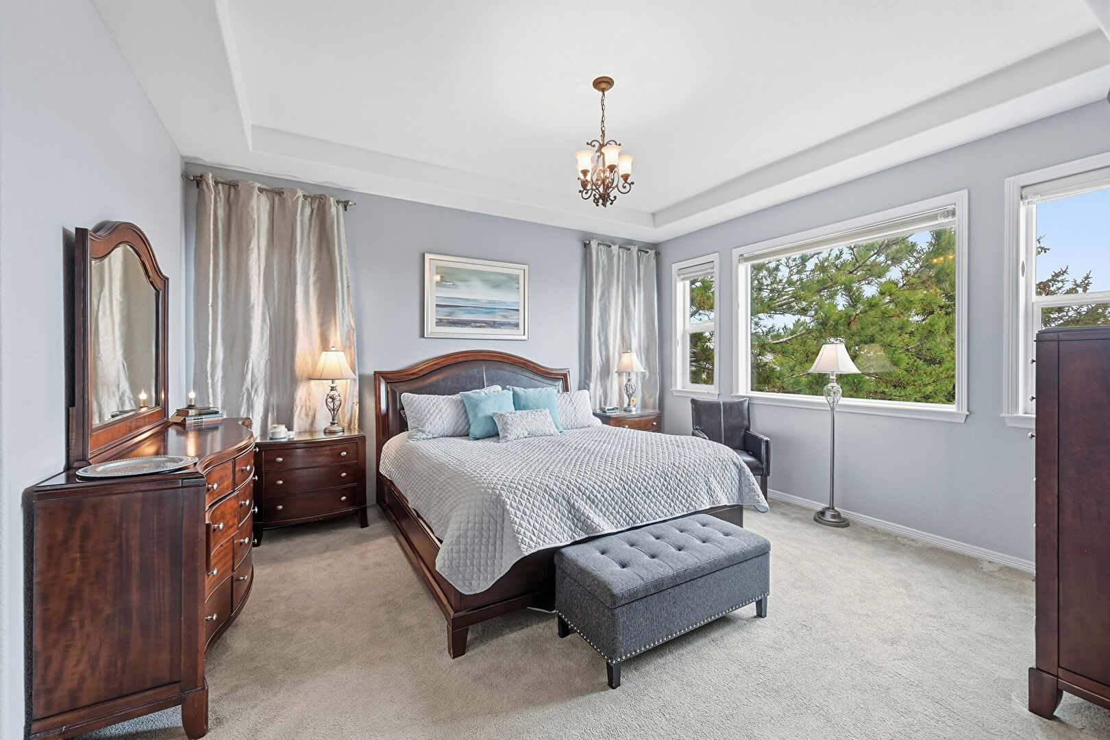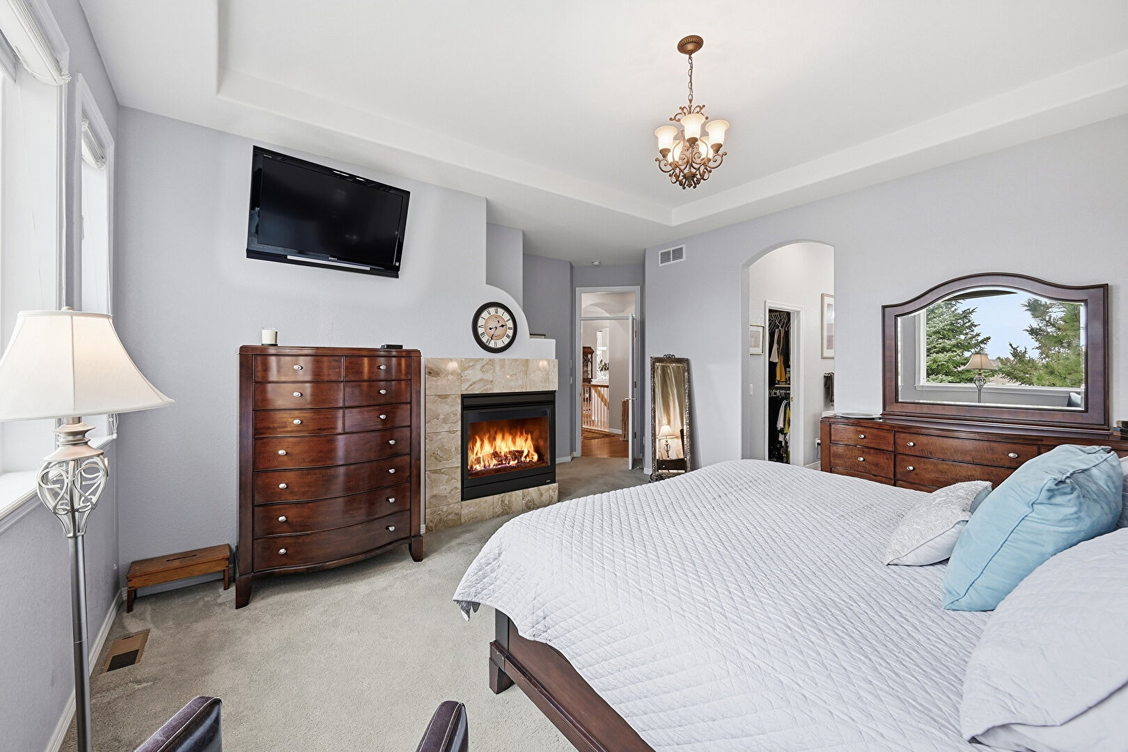 Arched Walkways, Baseboards Wall, Carpet, Ceiling Fan, Closet, Drywall, Ensuite Bathroom, Fireplace, Natural Light, Notable Chandelier, Tray Ceiling, Vent, Walk In Closet, Baseboards Wall, Carpet, Drywall, Fireplace
