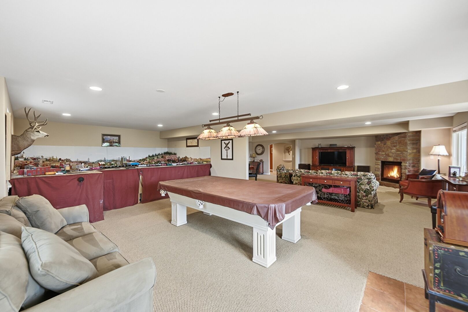 Baseboards Wall, Billiards, Carpet, Drywall, Fireplace, Recessed Lighting, Vent, Drywall, Natural Light