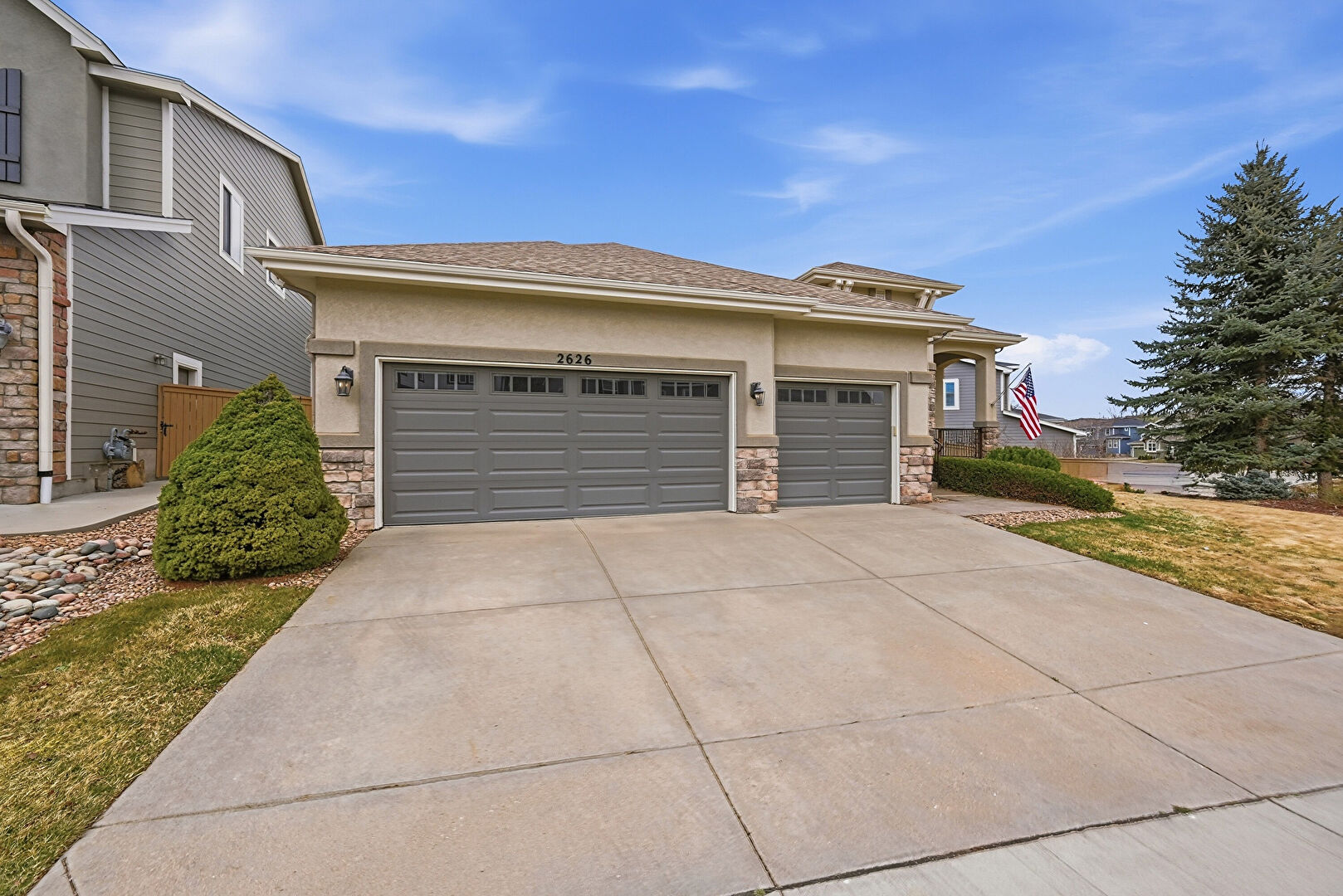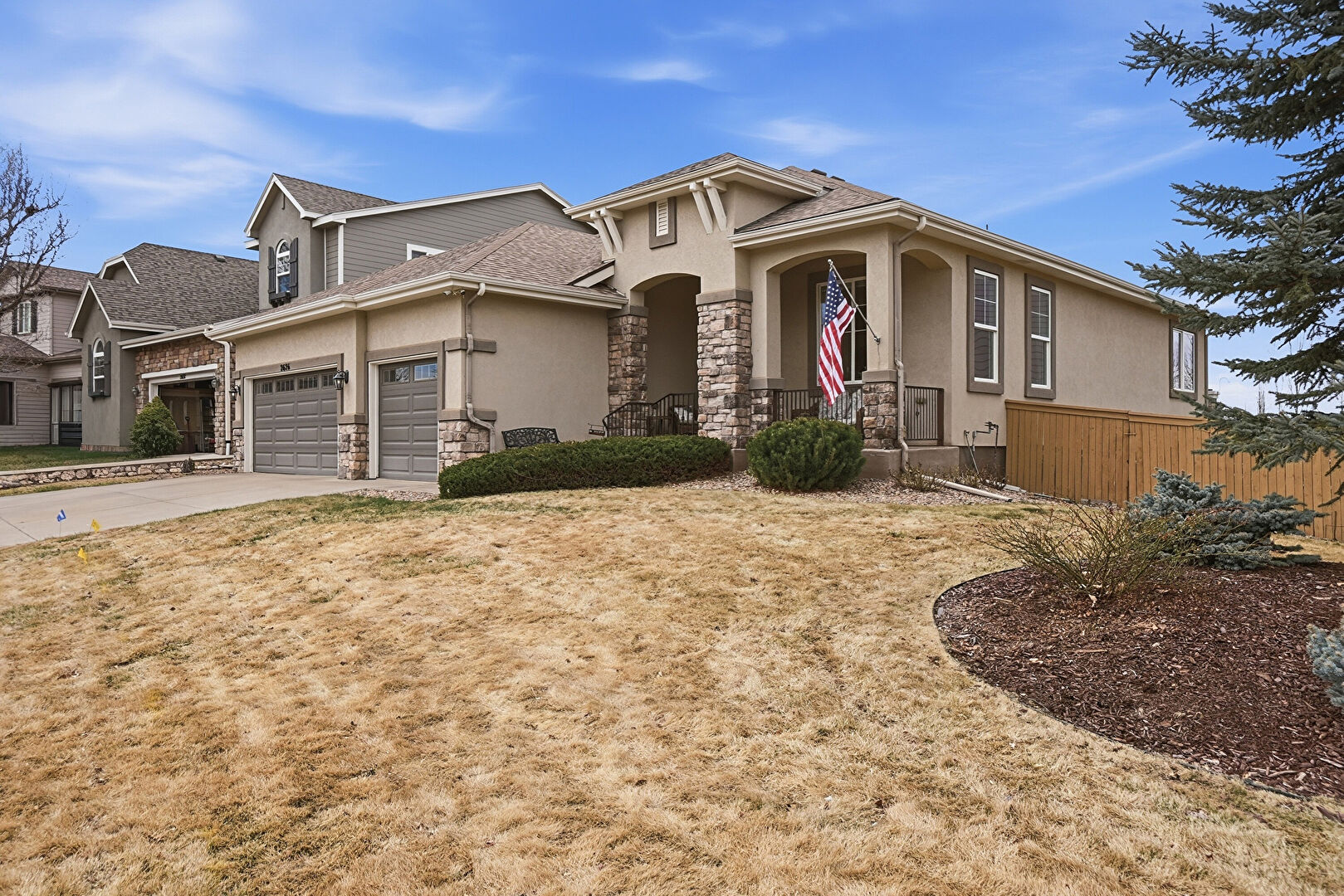 Concrete Foundation, Downspout, Driveway, Fence, Gas Meter, Gate, Gutters, Horizontal Siding, Lawn, Porch, Shingle Roof, Stairs, Stone Siding, Stoop, Stucco Siding, Downspout, Gas Meter, Lawn, Porch, Stoop
