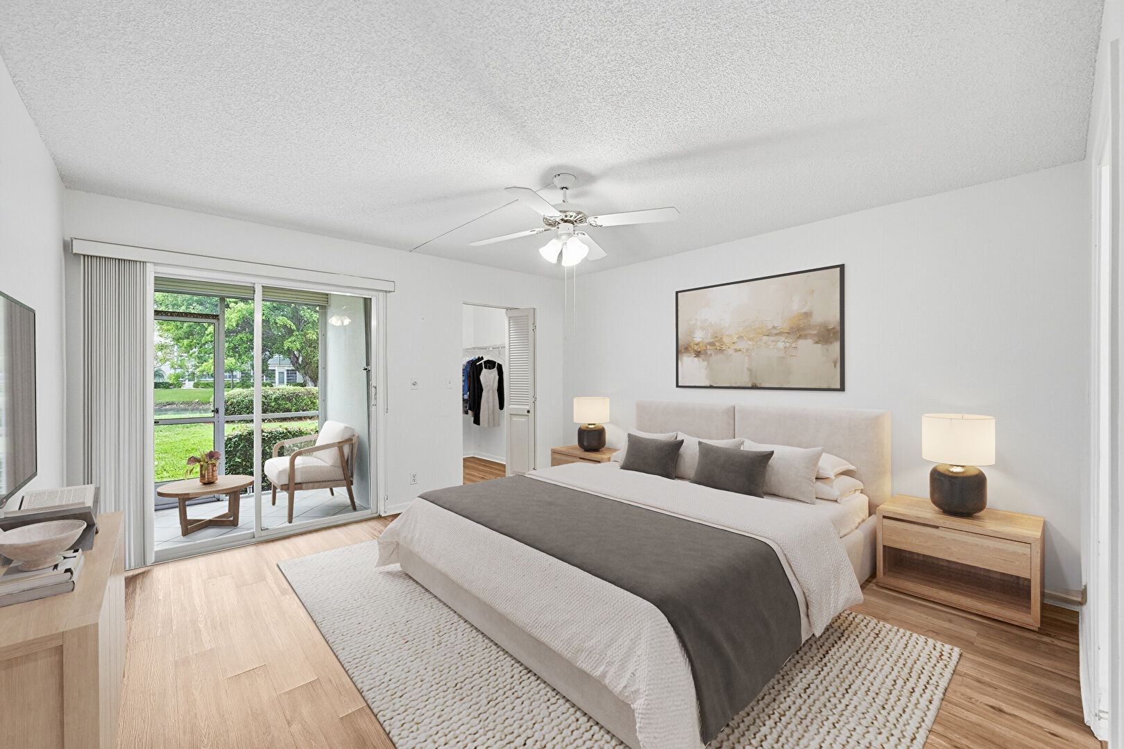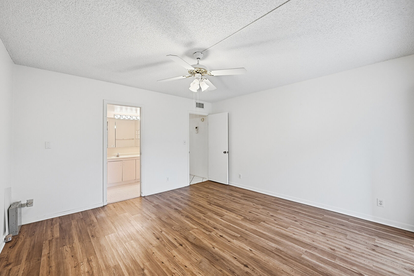 Access To Exterior, Baseboards Wall, Ceiling Fan, Drywall, Ensuite Bathroom, Natural Light, Textured Ceiling, Vent, Walk In Closet, Wood Finish Floor, Ceiling Fan, Closet, Natural Light, Vent