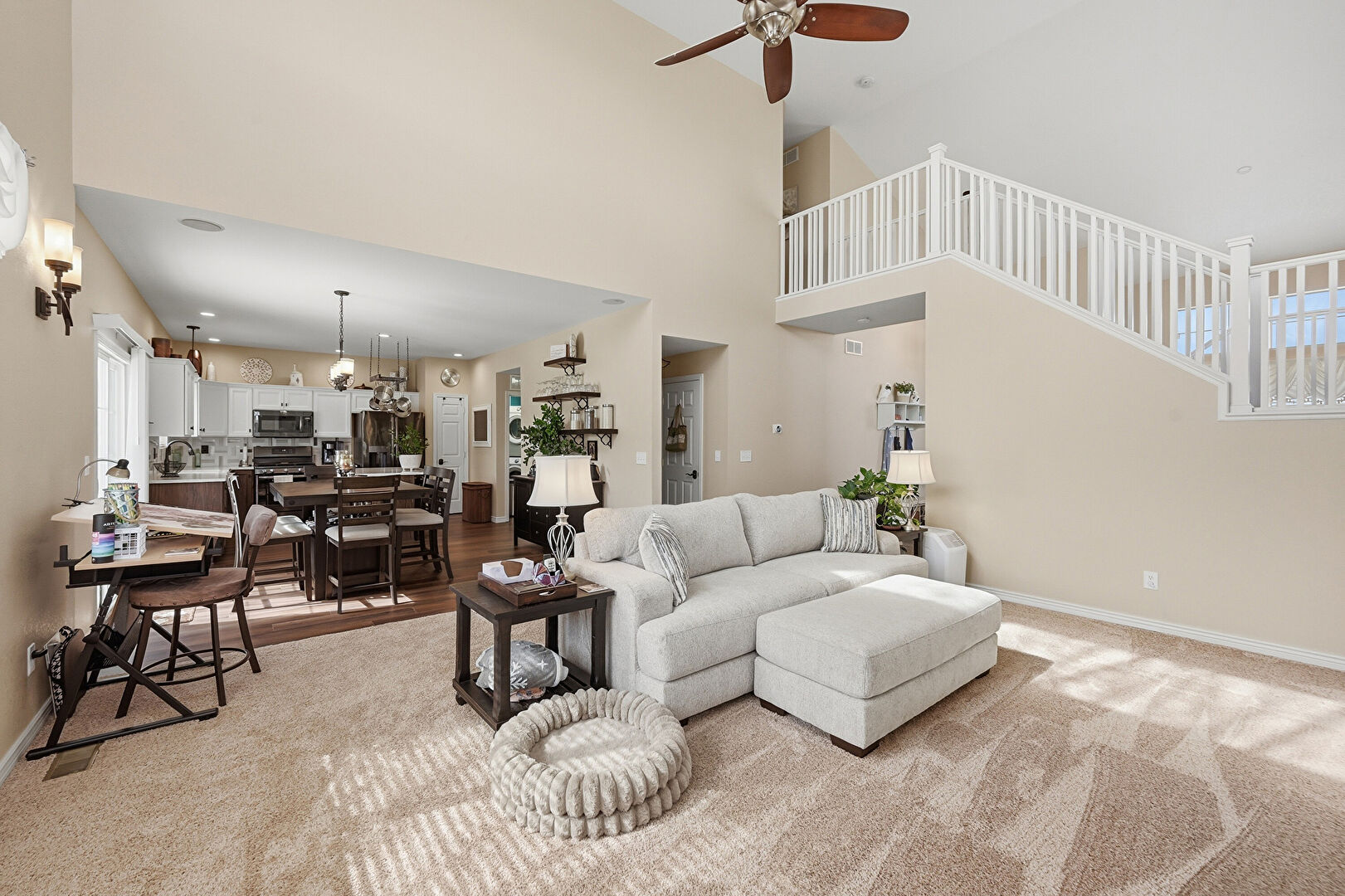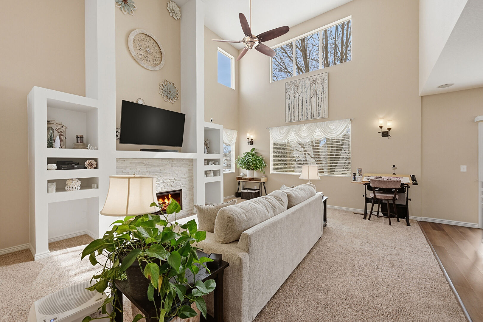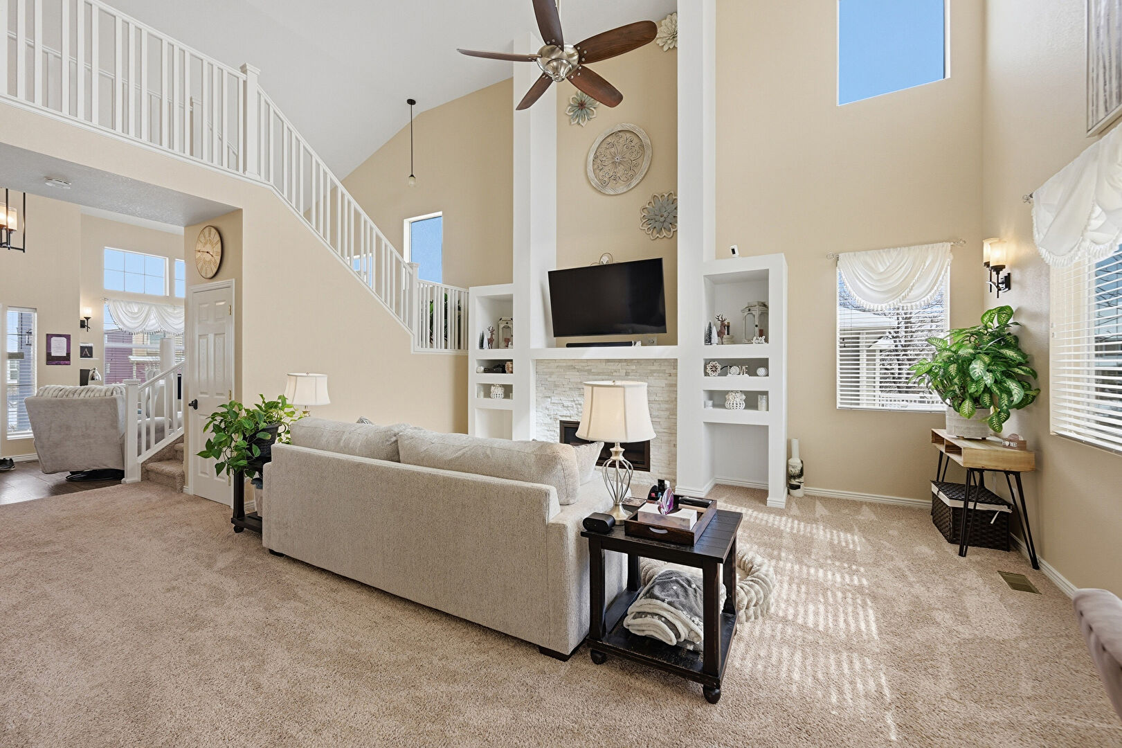 Baseboards Wall, Built In Shelves, Carpet, Ceiling Fan, Dehumidifier, Drywall, Fireplace, High Ceiling, Natural Light, Notable Chandelier, Stairs, Vent, Wood Finish Floor, Baseboards Wall, Built In Shelves, Natural Light, Recessed Lighting, Vent