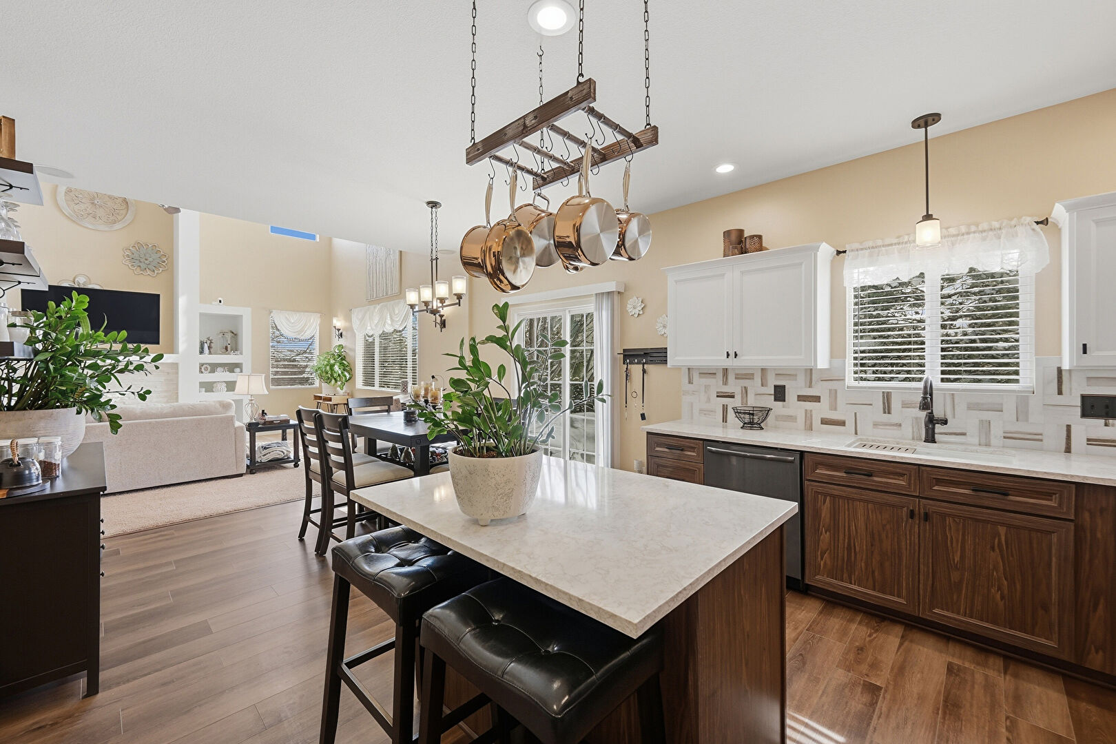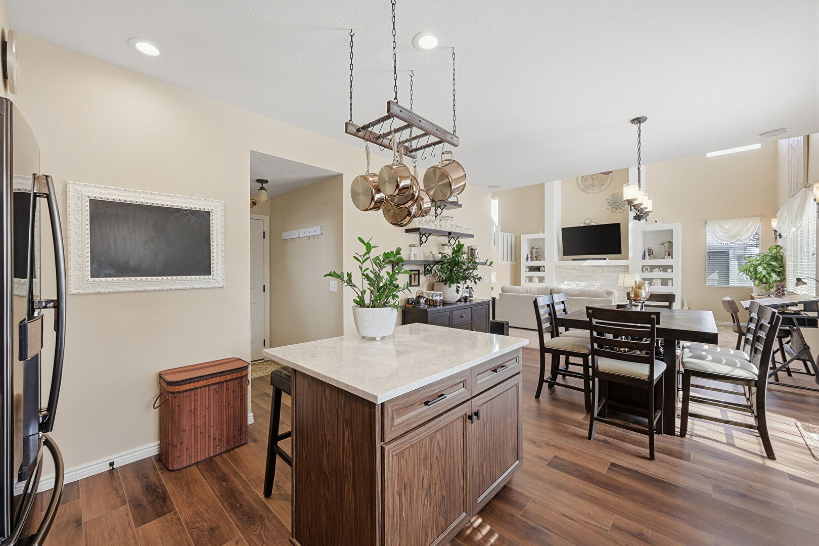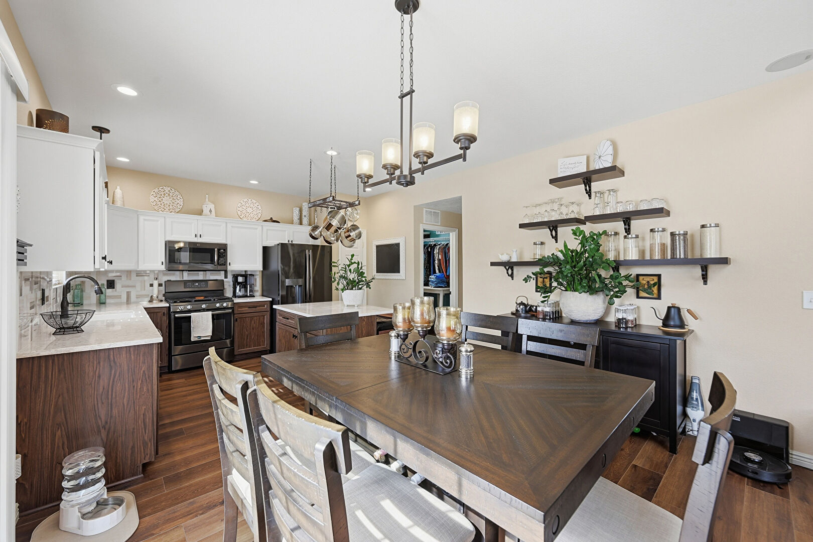 Baseboards Wall, Crown Molding Cabinets, Dark Brown Cabinets, Drywall, Kitchen Bar, Kitchen Island, L Shaped Kitchen, Medium Brown Cabinets, Natural Light, Notable Chandelier, Opens To Living Area, Pendant Lighting, Recessed Lighting, Shaker Cabinets, Stone Countertops, Vent, Wood Finish Floor, Dark Brown Cabinets, Kitchen Bar, Medium Brown Cabinets, Shaker Cabinets