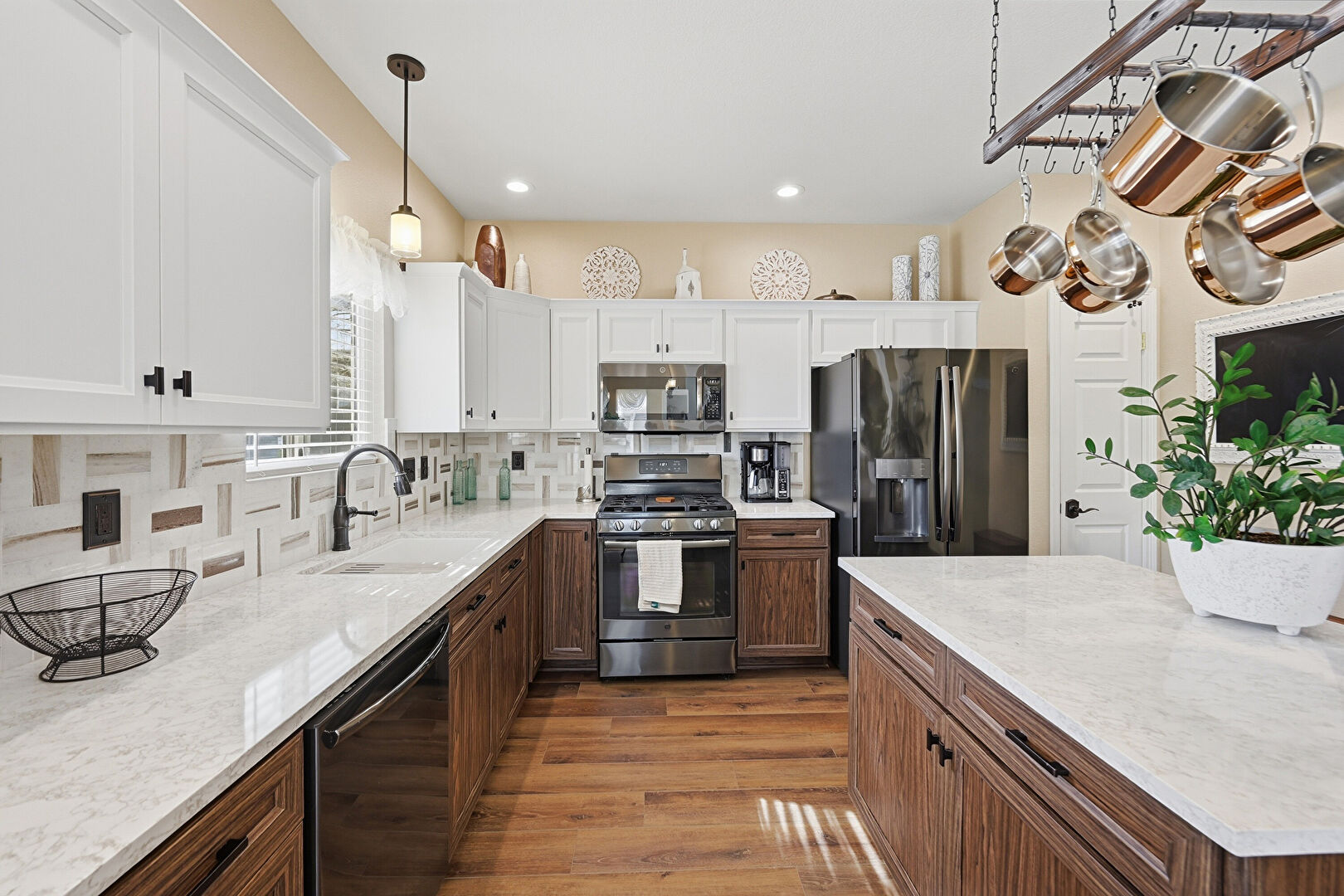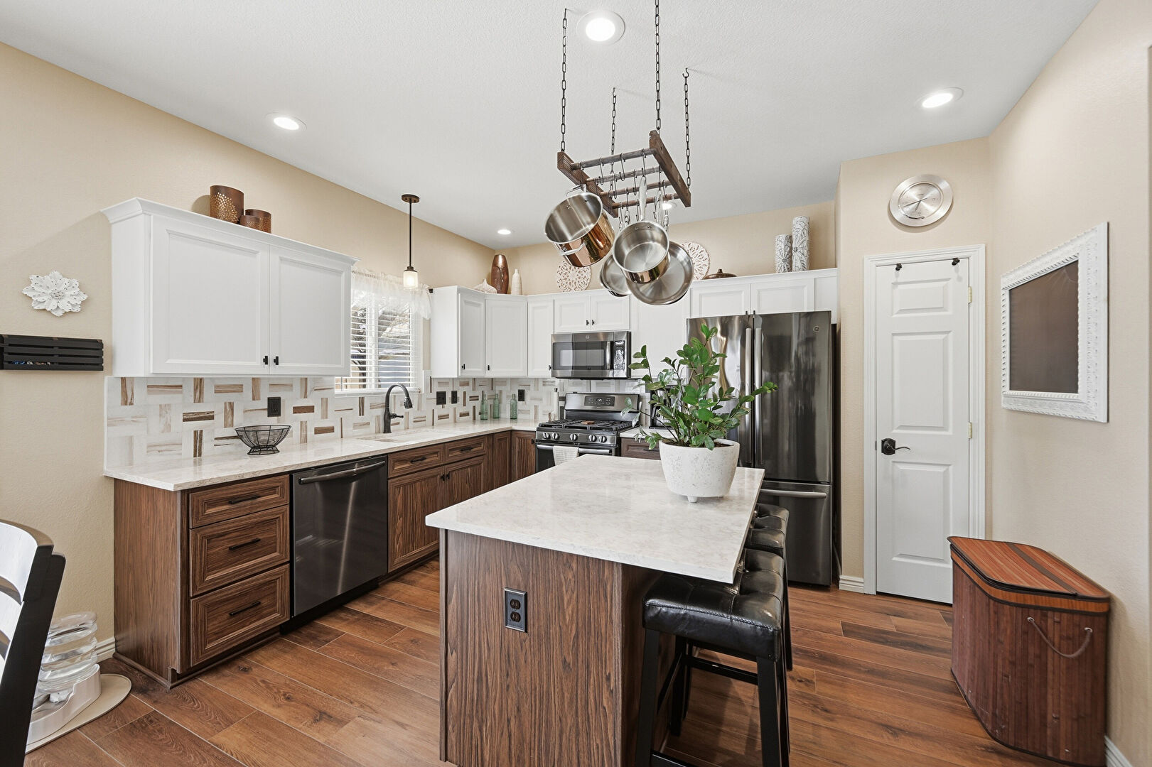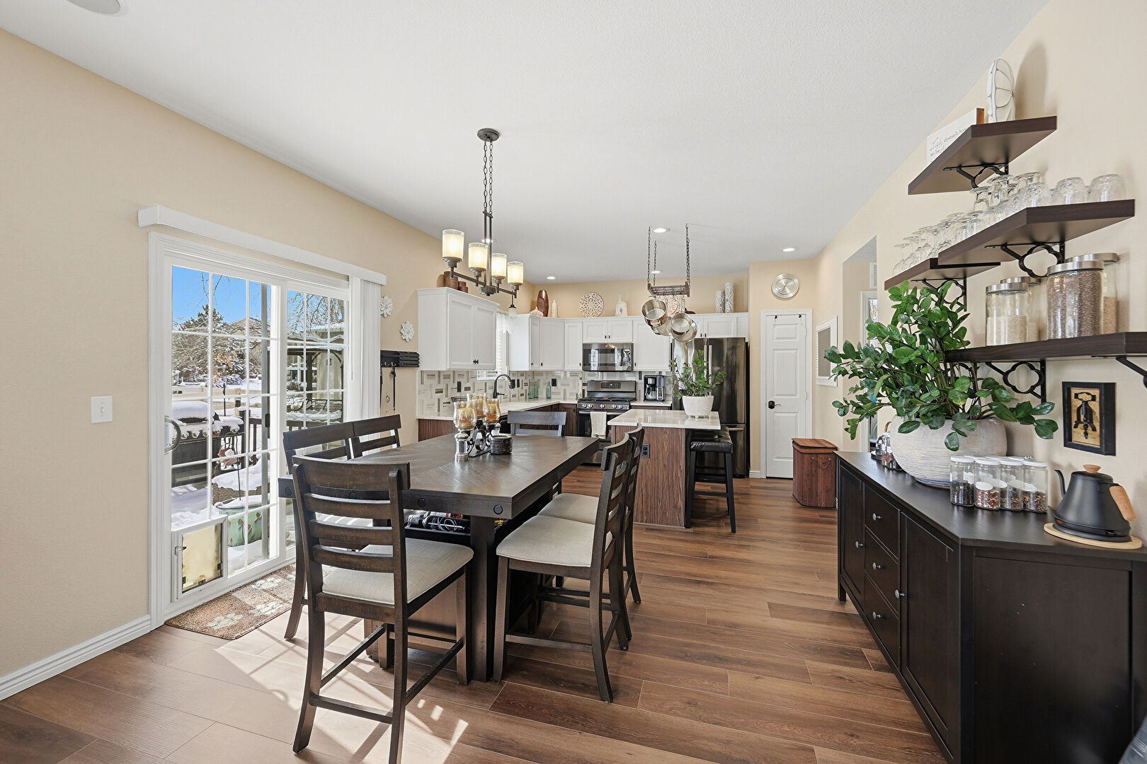Baseboards Wall, Crown Molding Cabinets, Dark Brown Cabinets, Drywall, Kitchen Bar, Kitchen Island, L Shaped Kitchen, Medium Brown Cabinets, Natural Light, Notable Chandelier, Opens To Living Area, Pendant Lighting, Recessed Lighting, Shaker Cabinets, Stone Countertops, Vent, Wood Finish Floor, Dark Brown Cabinets, Kitchen Bar, Medium Brown Cabinets, Shaker Cabinets