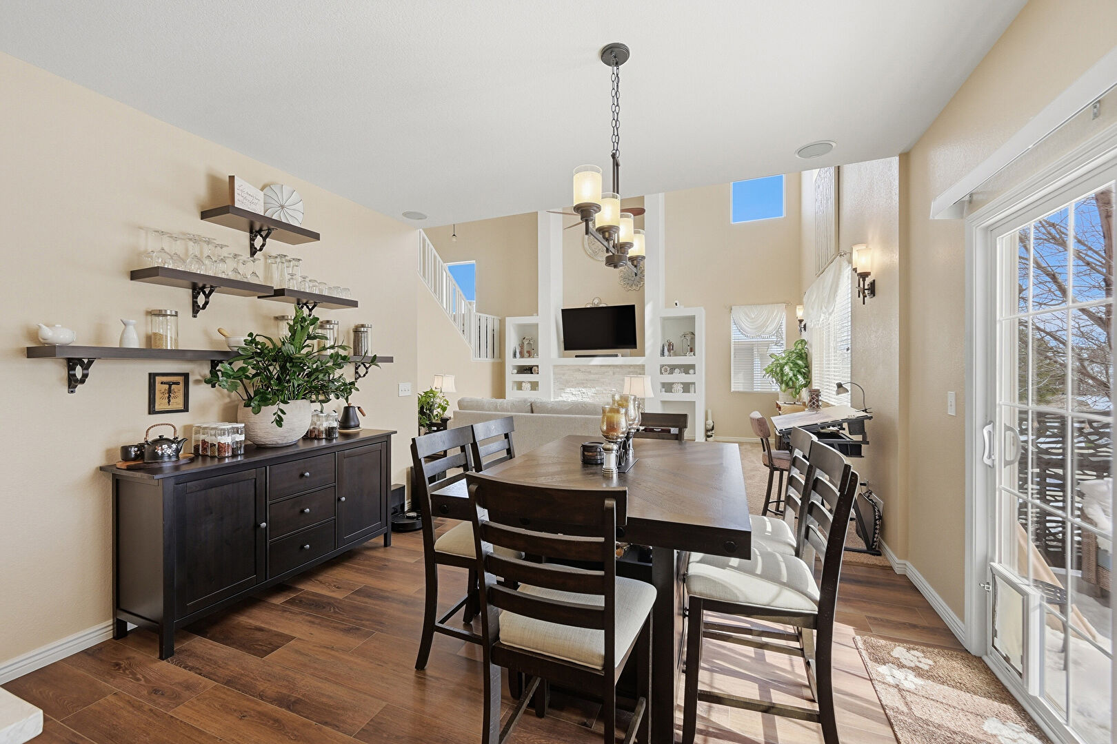 Baseboards Wall, Drywall, Fireplace, High Ceiling, L Shaped Kitchen, Natural Light, Notable Chandelier, Recessed Lighting, Stairs, Wood Finish Floor, Drywall, Wood Finish Floor