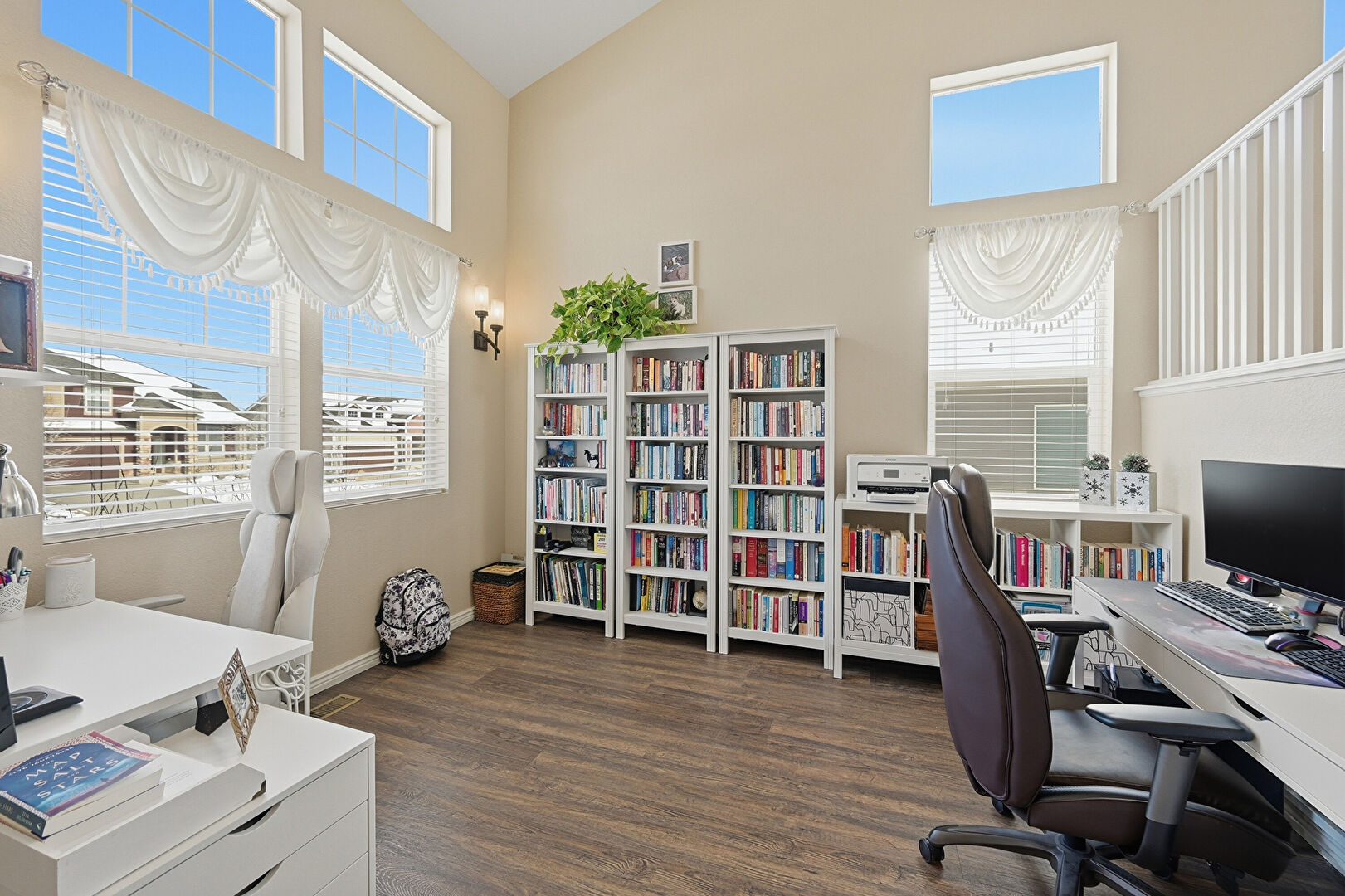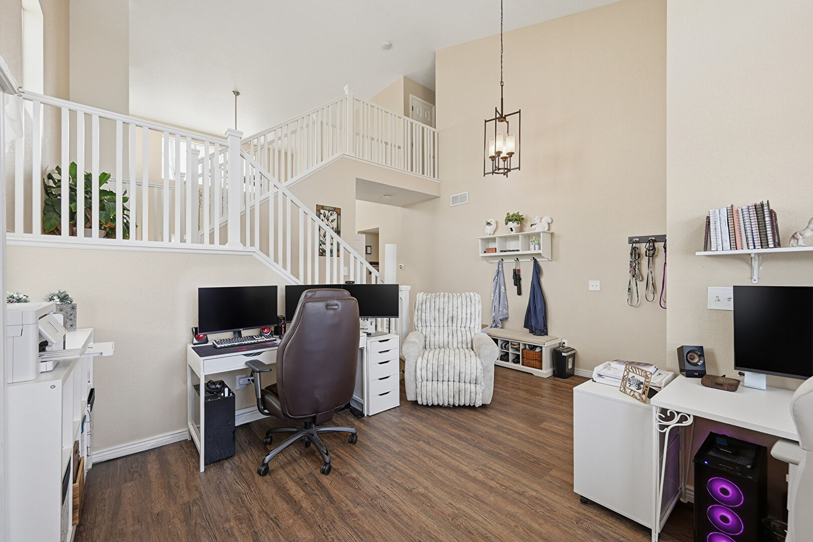 Baseboards Wall, Drywall, High Ceiling, Natural Light, Office Area, Vent, Wood Finish Floor, Ceiling Fan, Notable Chandelier, Office Area
