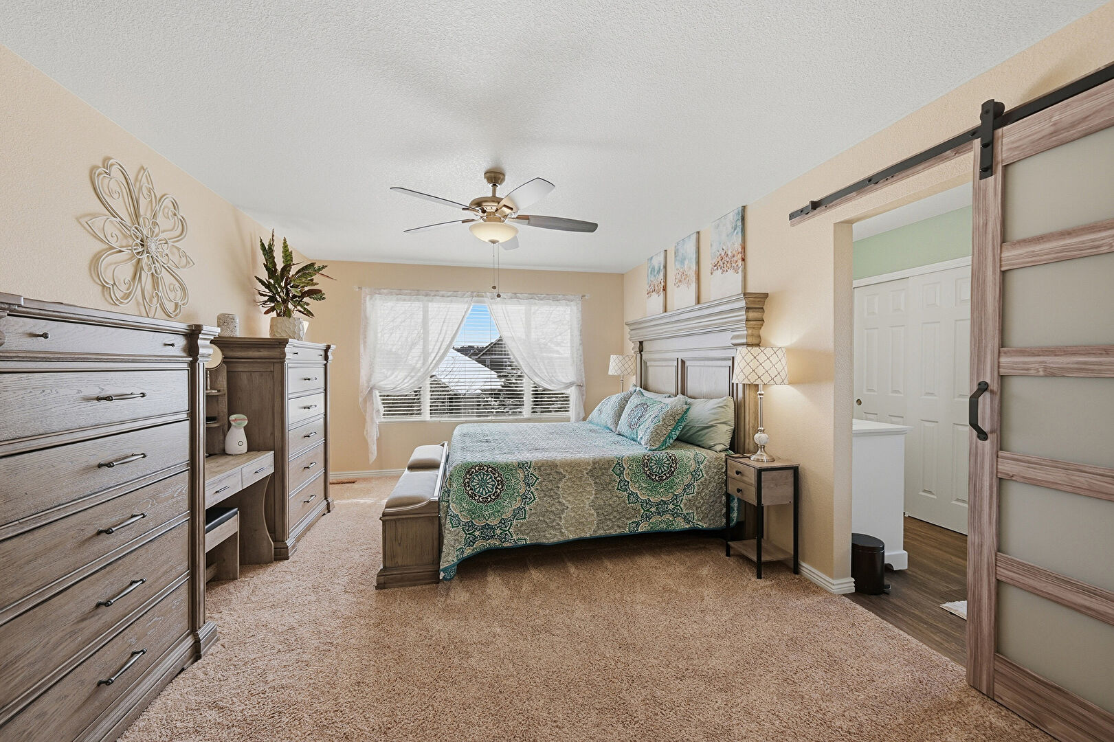 Barn Door, Baseboards Wall, Carpet, Ceiling Fan, Drywall, Natural Light, Textured Ceiling, Drywall, Vent