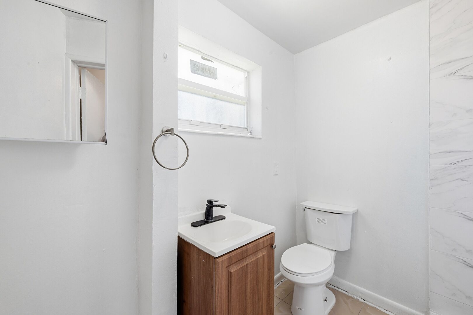 Baseboards Wall, Combined Bath Shower, Drywall, Full Bathroom, Tile Floor, Vanity, Vent, Full Bathroom, Natural Light
