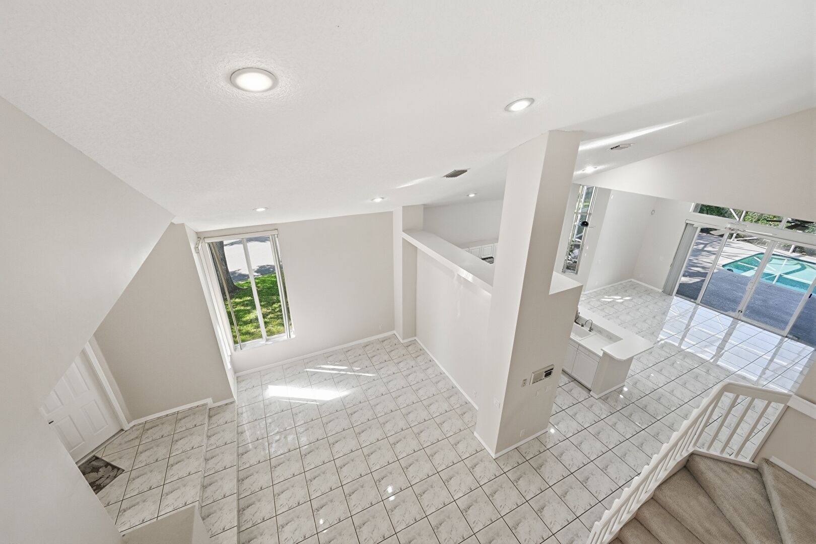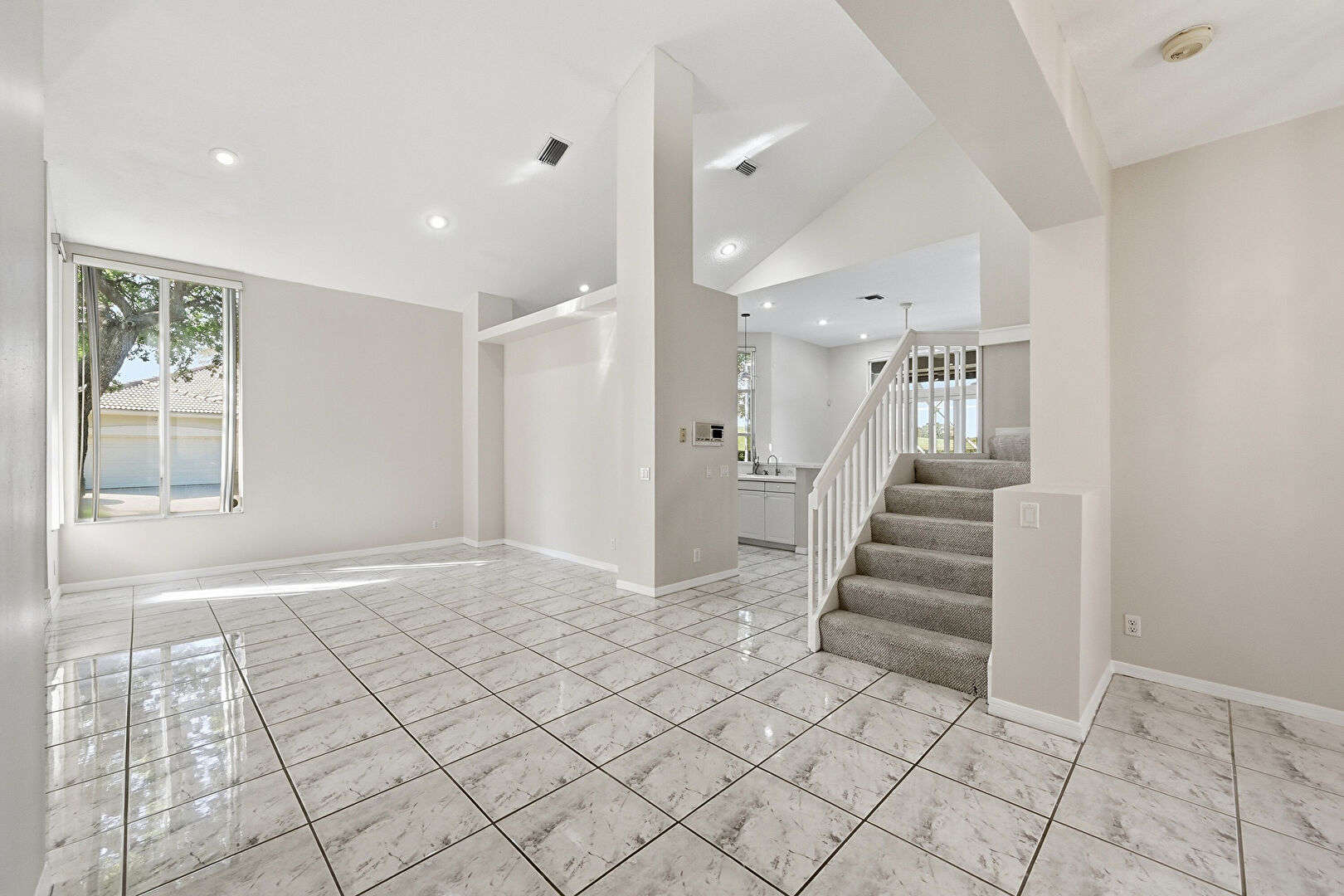 Baseboards Wall, Drywall, High Ceiling, Recessed Lighting, Smoke Carbon Monoxide Detector, Stairs, Vaulted Ceiling, Marble Finish Floor