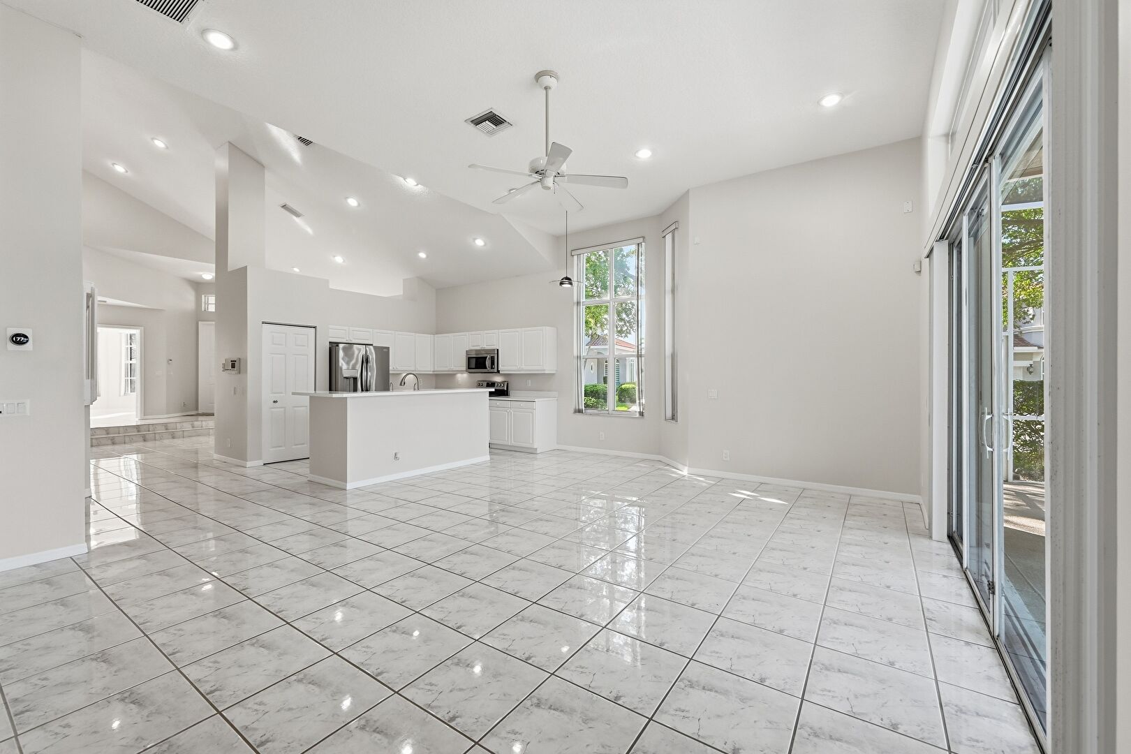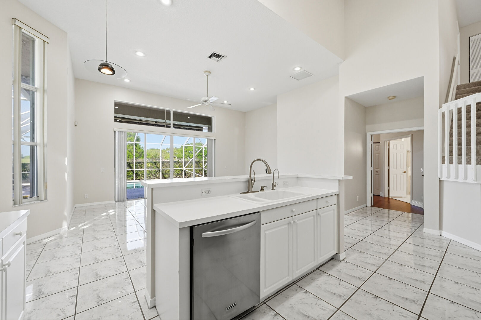 Baseboards Wall, Ceiling Fan, Drywall, High Ceiling, Kitchen Island, L Shaped Kitchen, Marble Finish Floor, Natural Light, Opens To Living Area, Pendant Lighting, Raised Cabinets, Recessed Lighting, Sunroom, Tile Floor, Vaulted Ceiling, Vent, Recessed Lighting, Vent