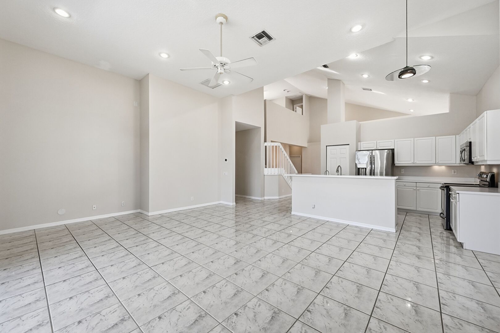 Baseboards Wall, Ceiling Fan, Drywall, High Ceiling, Kitchen Bar, Kitchen Island, L Shaped Kitchen, Marble Finish Floor, Natural Light, Opens To Living Area, Pendant Lighting, Raised Cabinets, Recessed Lighting, Vaulted Ceiling, Vent, Baseboards Wall, Drywall, Kitchen Island, Marble Finish Floor, Tile Floor