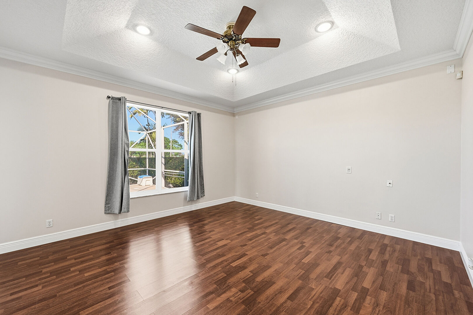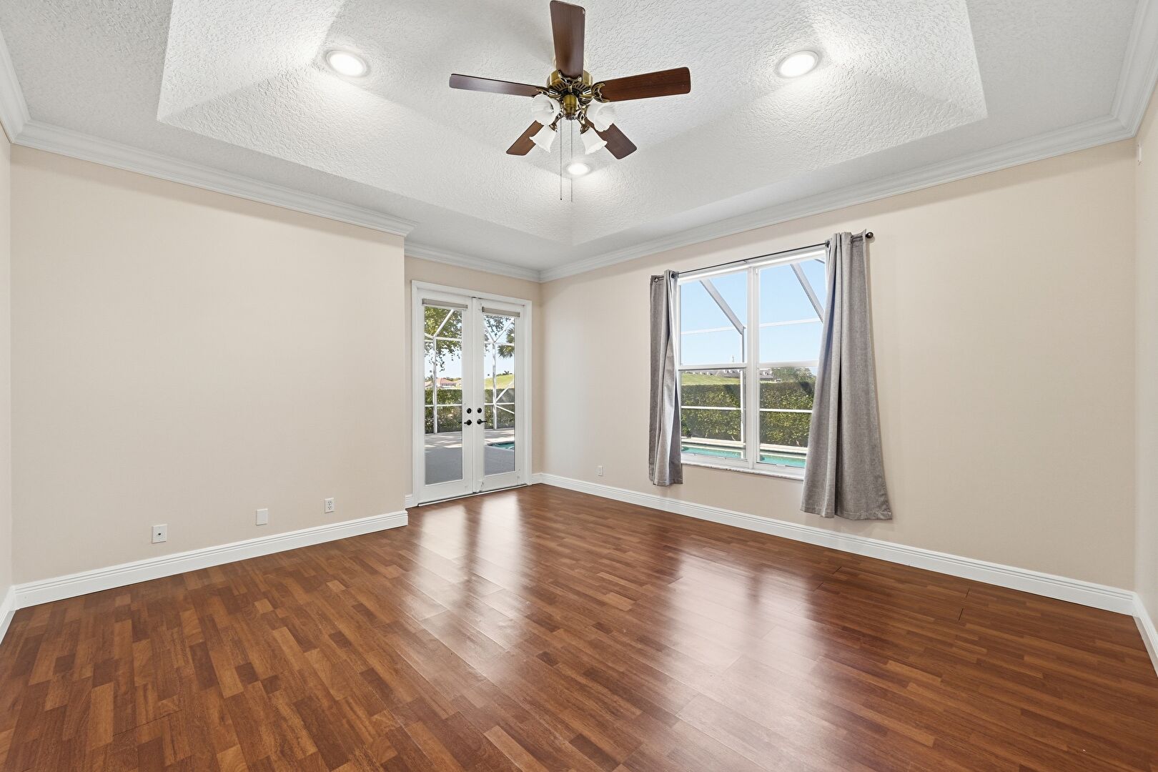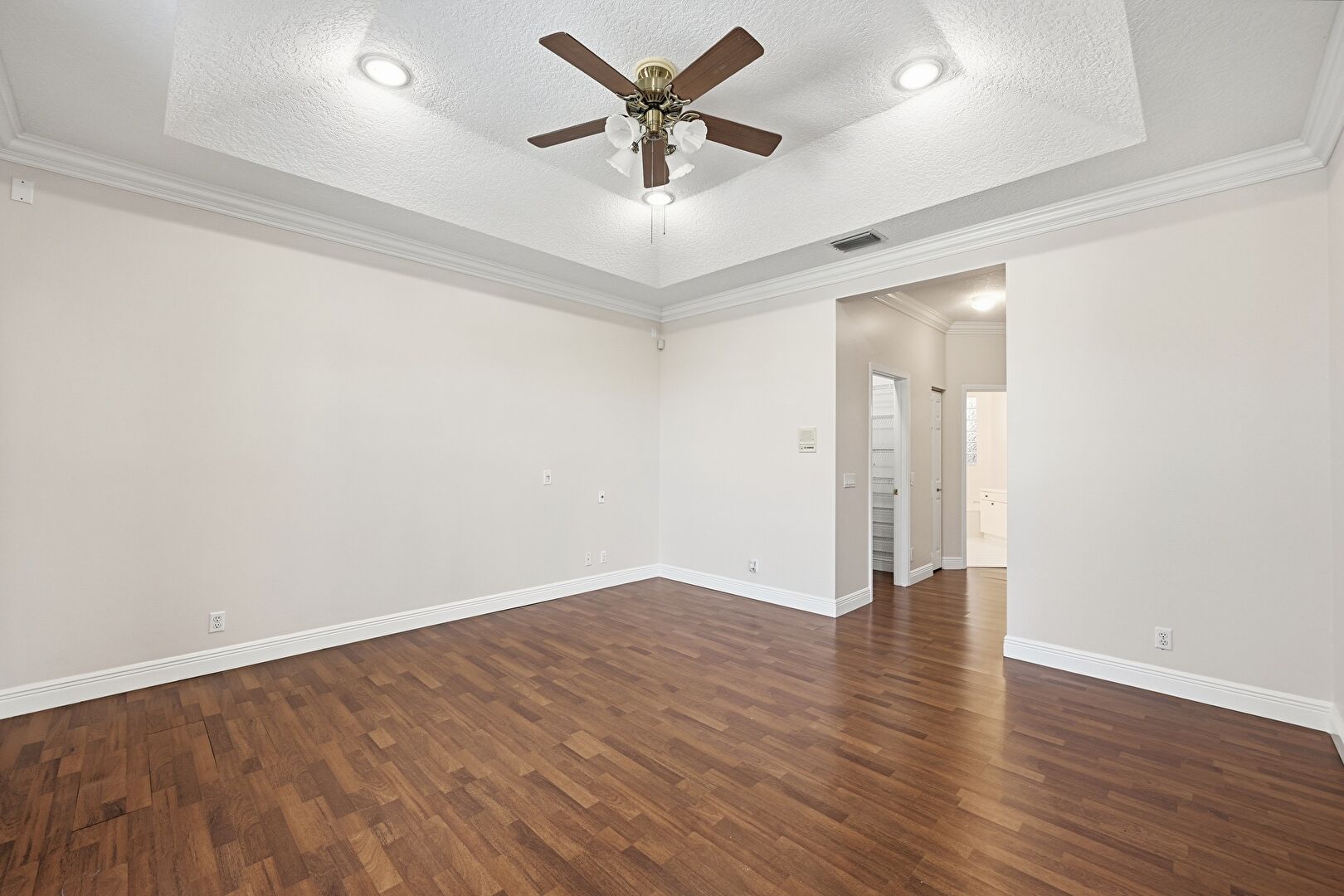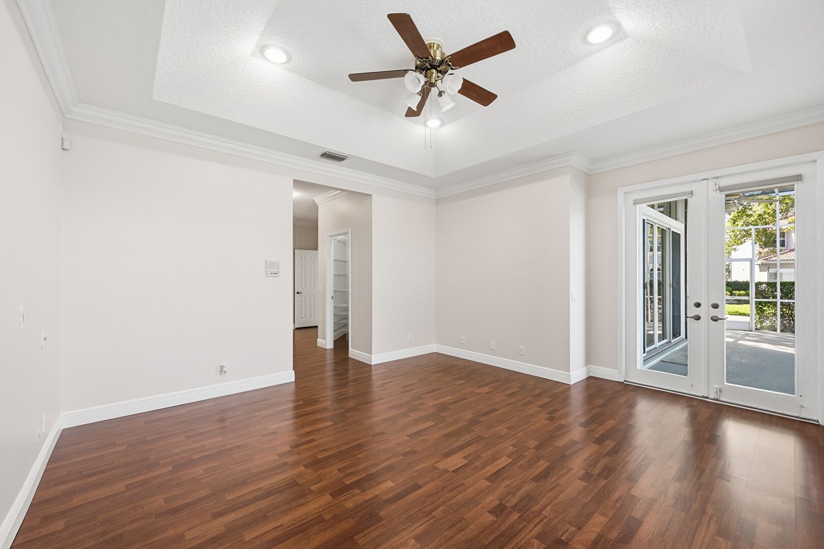 Baseboards Wall, Ceiling Fan, Crown Molding, Drywall, French Doors, Natural Light, Recessed Lighting, Textured Ceiling, Tray Ceiling, Vent, Wood Finish Floor, Ceiling Fan, Crown Molding, Drywall, Vent, Wood Finish Floor