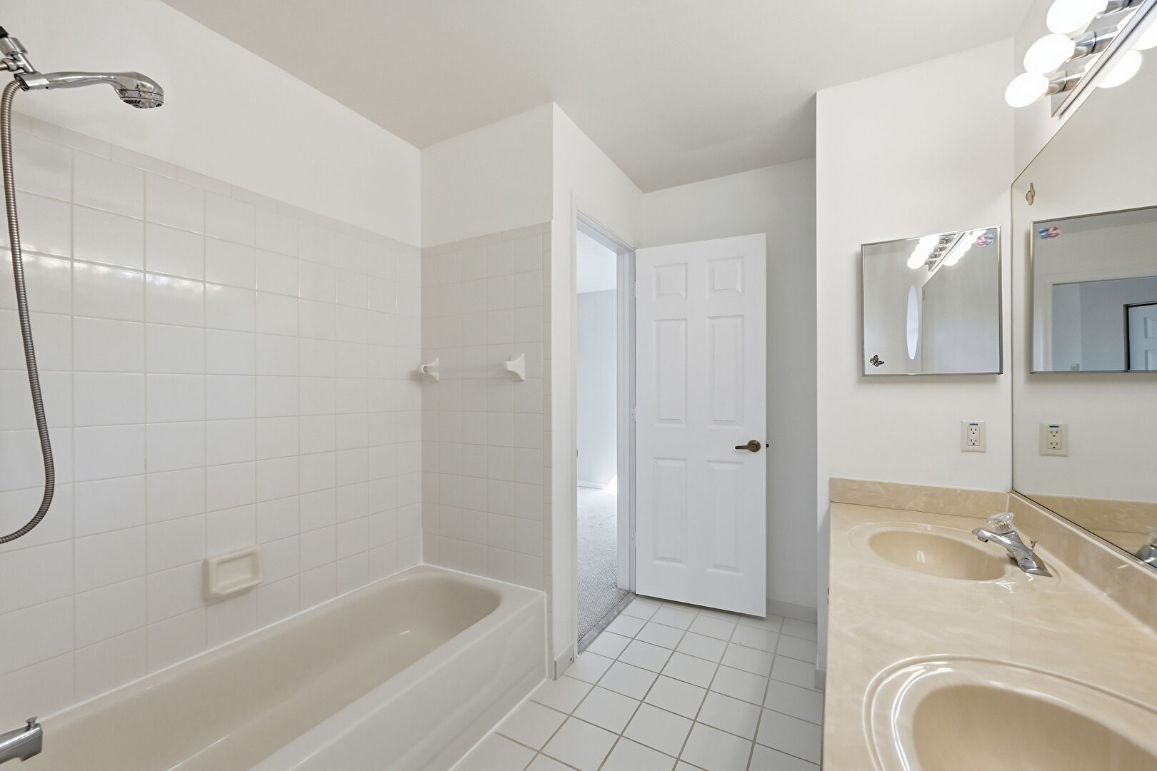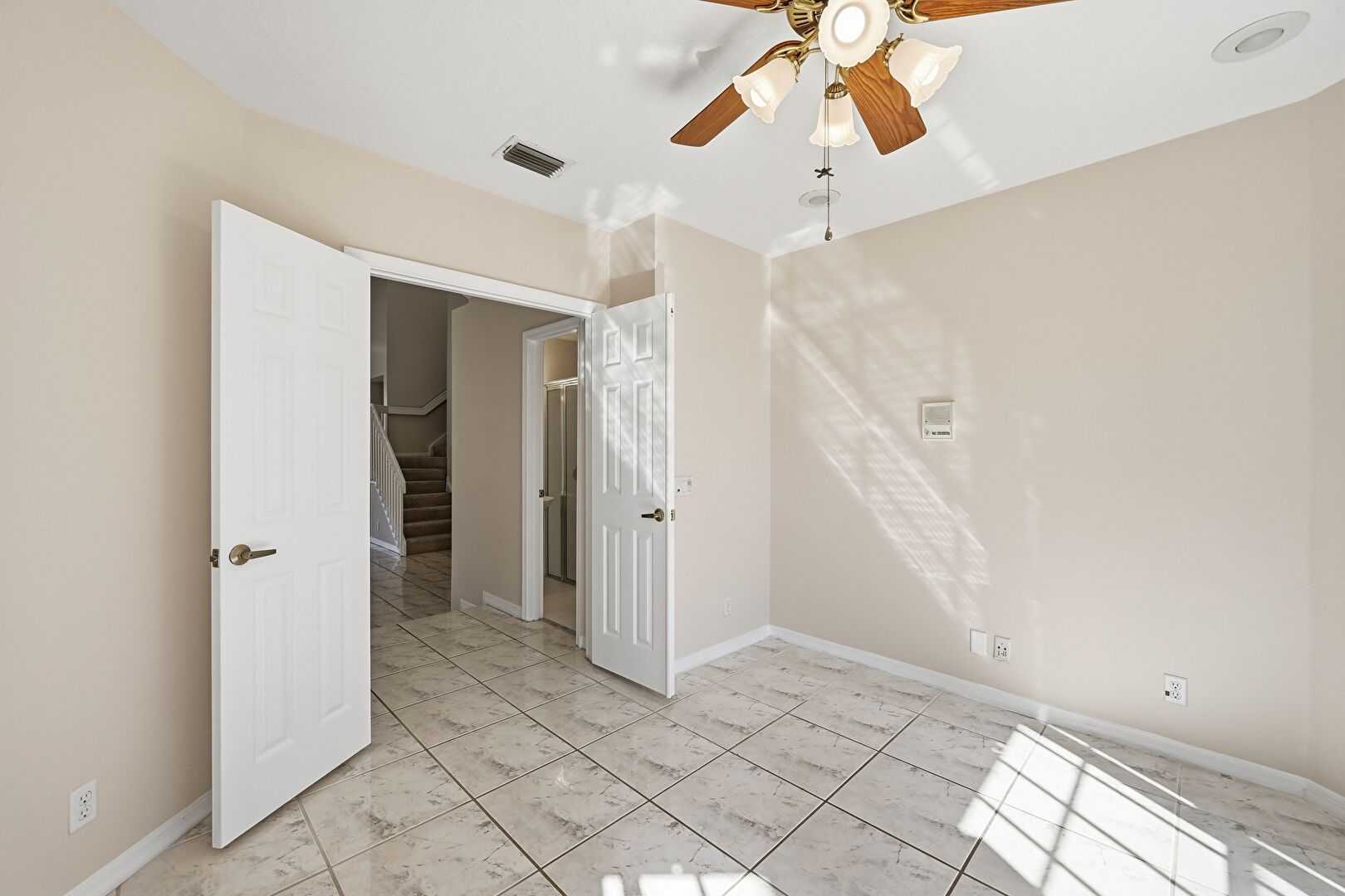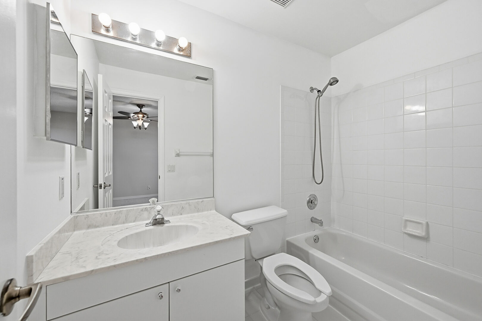 Baseboards Wall, Carpet, Combined Bath Shower, Double Vanity, Drywall, Full Bathroom, Tile Floor, Vanity, Vent, Ceiling Fan, Drywall, Tile Floor, Vent