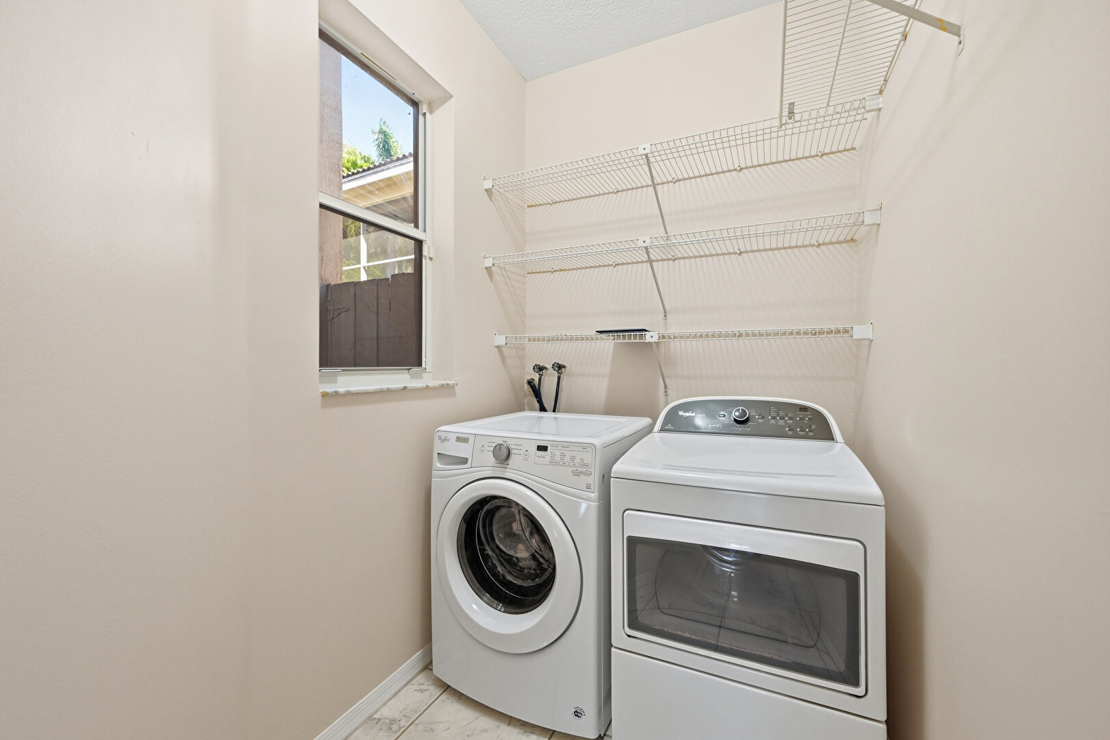 Drywall, Laundry, Natural Light, Textured Ceiling, Washer Hookup, Baseboards Wall