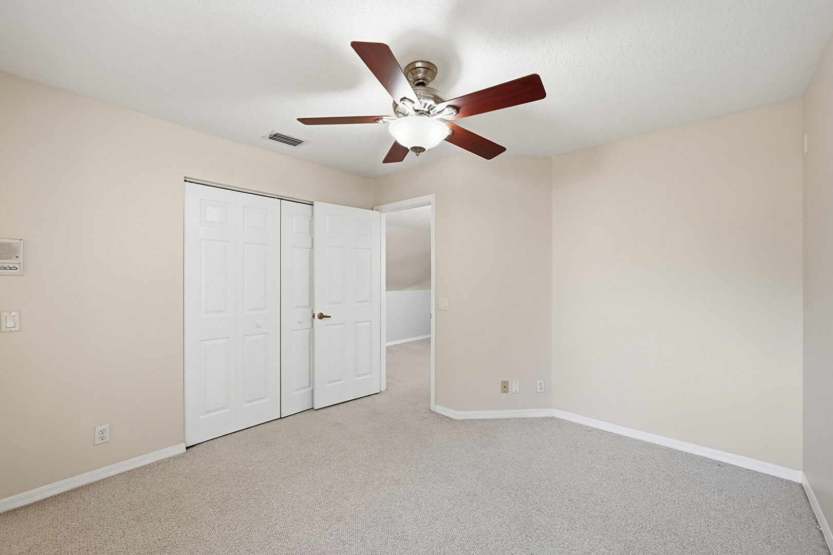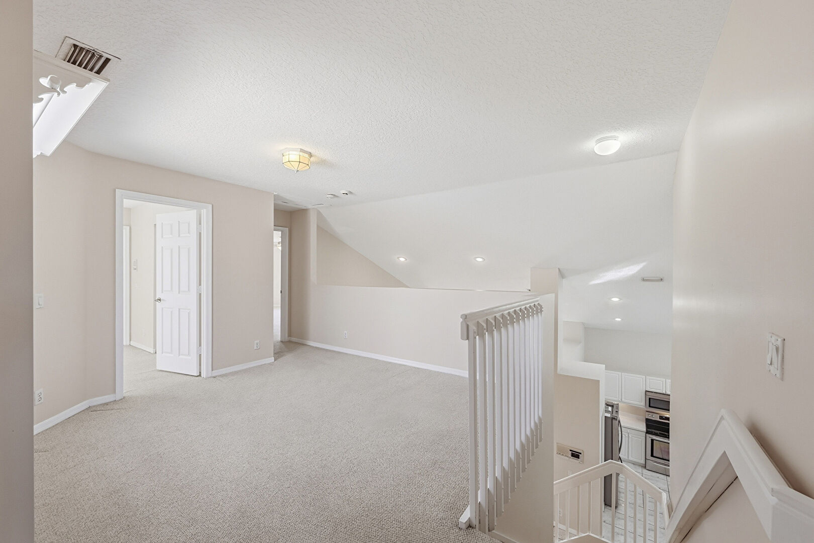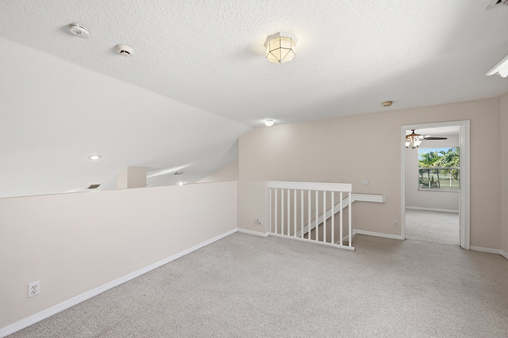 Baseboards Wall, Carpet, Ceiling Fan, Closet, Drywall, Loft, Natural Light, Smoke Carbon Monoxide Detector, Textured Ceiling, Upstairs Landing, Vaulted Ceiling, Vent, Carpet, Natural Light, Textured Ceiling